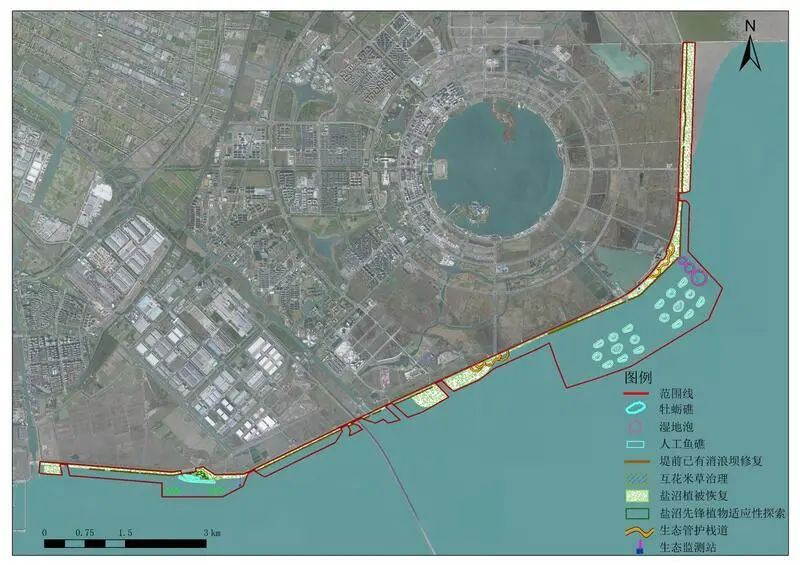 比如,综合应用消浪坝原位修复、牡蛎礁群固滩技术,保护修复“高—中—低滩”梯度盐沼湿地生境,发挥其护滩养滩、消浪防潮、生态减灾的协同增效功能。实现盐沼湿地生境—植被—底栖生物全链条修复与恢复,发挥其碳汇价值。建立盐沼湿地生态监测站和碳通量塔,开展生态环境跟踪监测,综合评估修复效果。