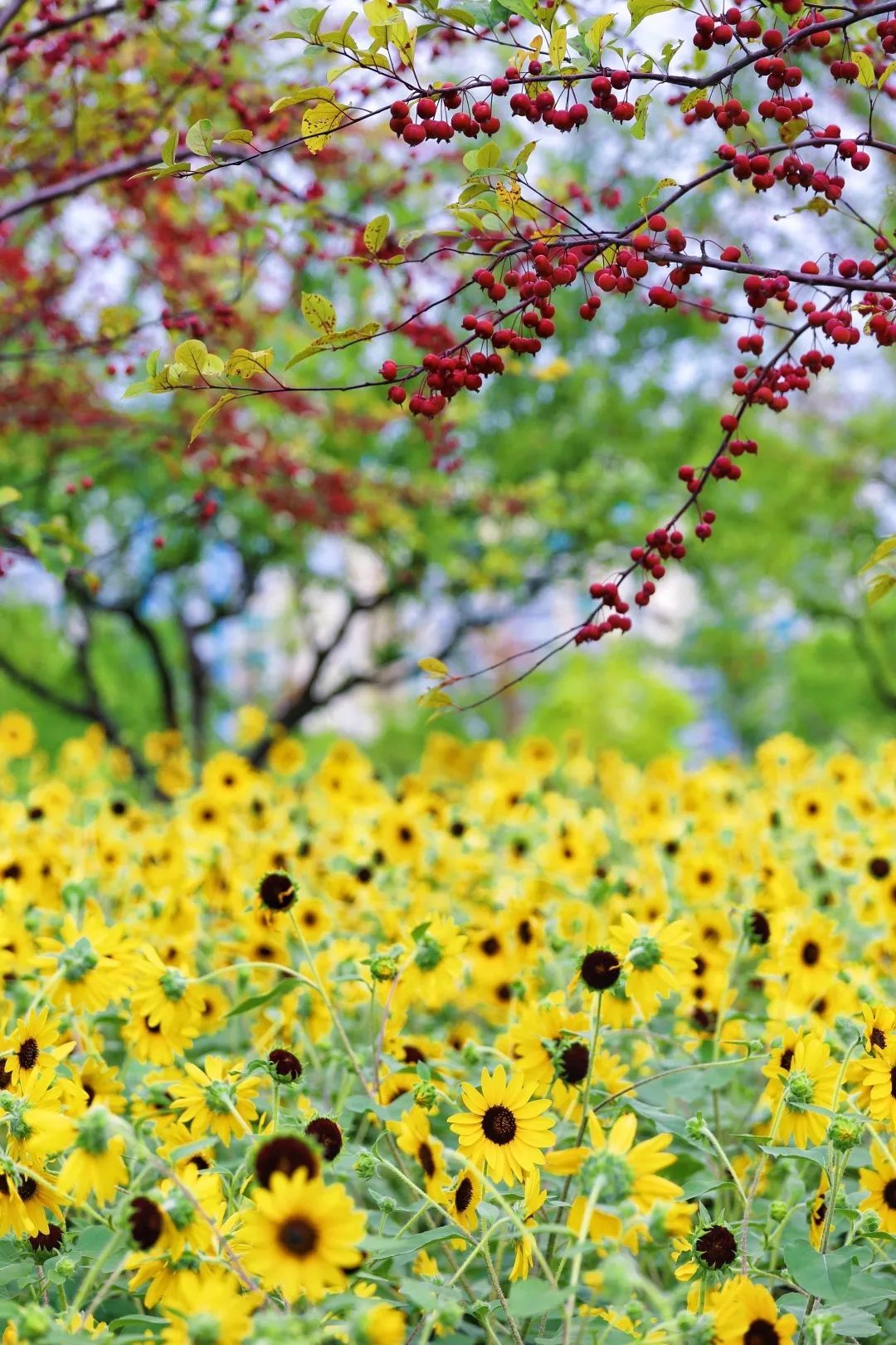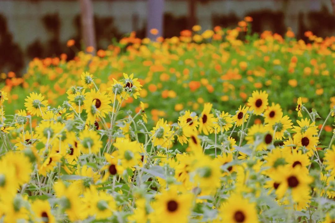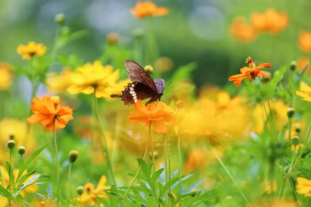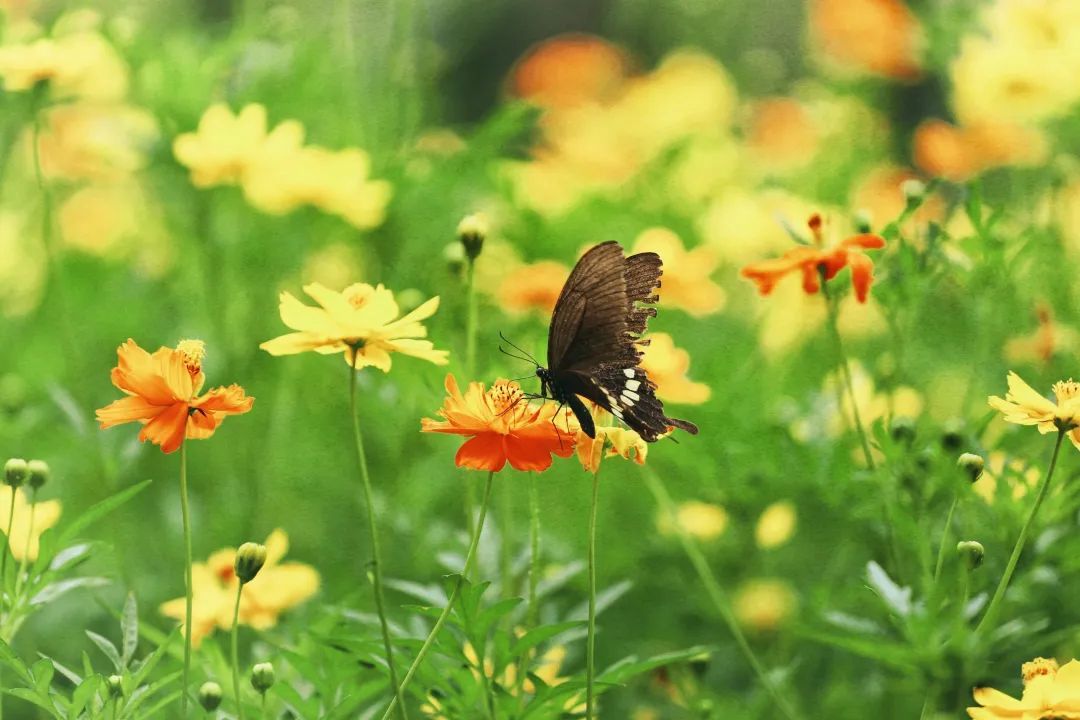 硫华菊绚丽明艳,在阳光下尽情绽放,层层叠叠,远远看去就像一片金色海洋。柔枝随着清风摆动,灵动曼妙,艳丽的花朵引来了不少蝴蝶和蜜蜂飞舞其中,就如朱绍宗《菊丛飞蝶图》和和齐白石《花卉蝴蝶双飞图》中描绘的景致一般,充满浪漫和美好。