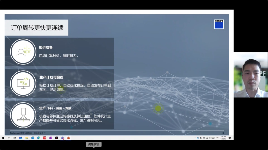 例如,后疫情时代,钣金加工行业作为离散制造业面临着诸多的机遇和挑战,通快(中国)有限公司产品经理李锦华在《通快技术赋能离散智能制造新模式》的主题分享中表示,离散制造业数字化转型之后的未来趋势是“通过生产管理系统打造透明化生产车间,借助自动化设备优化车间内部物流,打造专属的智能钣金工厂。最终实现各个工序满负荷生产,物流高效,实现‘类连续生产’”。
