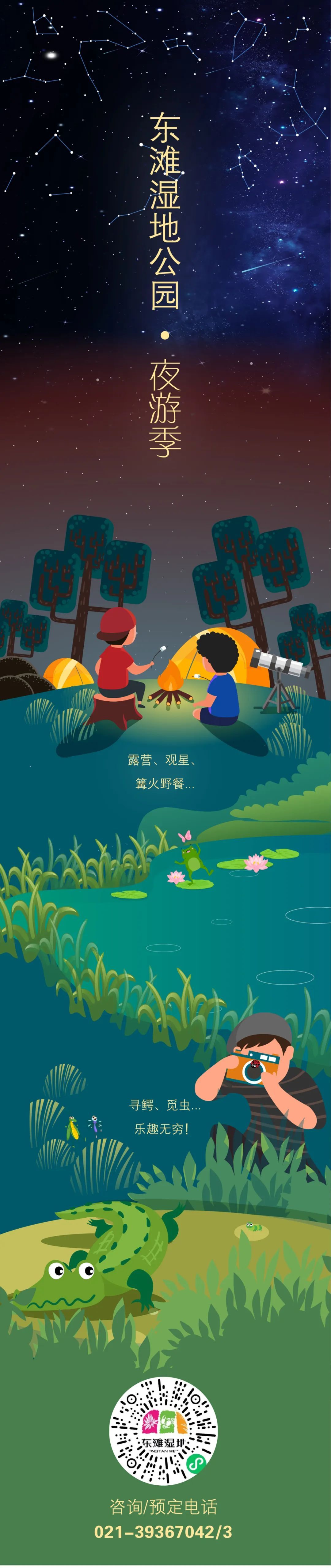 东滩湿地公园的夏夜露营活动正在火热开展中,除了小虫虫们在狂欢,还有调皮的扬子鳄等着你来探寻,浩瀚的星空等着你来徜徉,美味的烧烤自助等着你来品尝。