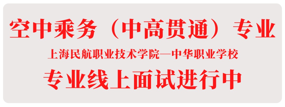 报考本校自主招生批次中职提前批航空服务(空中乘务)、艺术设计与制作、戏剧表演(影视表演)也需在2022年7月13日0点至2022年7月19日15点上传在线面试/考试资料,具体请在微信公众号中,查找“中华职业学校”并关注,在“招生专栏”中按提示完成资料上传。