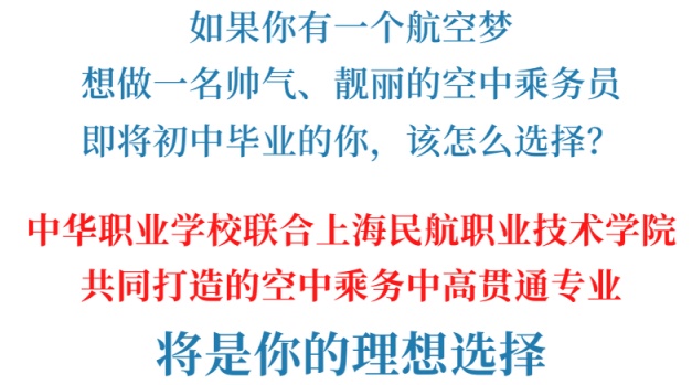空中乘务(中高职贯通)专业是中华职业学校与上海民航职业技术学院合作举办的五年制中高职贯通专业。培养面向航空公司和民航服务企业,适应民航现代化生产、管理和服务一线需要、具有创新精神和良好客舱服务职业素养,具备从事客舱服务专业基础理论知识和较强实践动手能力,具有职业生涯发展基础的应用型高技能专门人才。