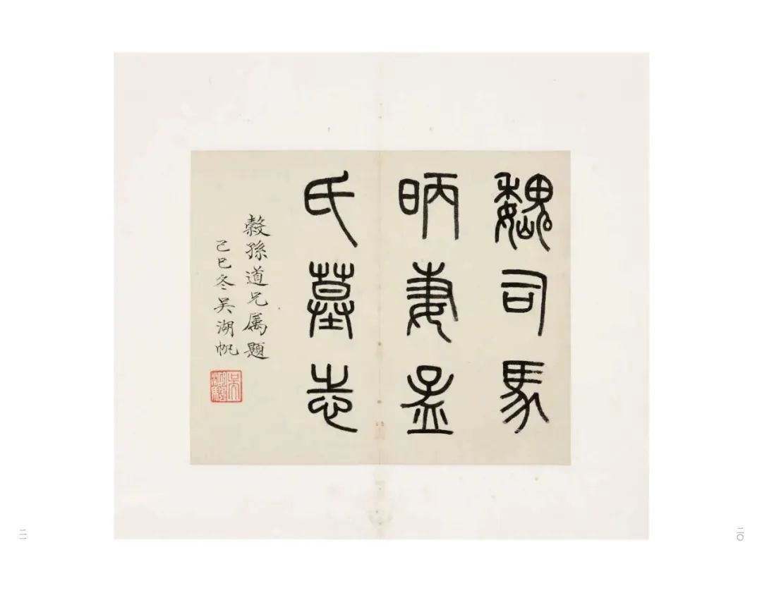 第三辑所刊隋《常丑奴墓志》,或许不为普通读者所熟知,但与它同为隋墓志的《董美人墓志》大家并不陌生吧。殊不知,在近代碑帖收藏界流传的一段“既丑且美”的收藏佳话,主角正是第三辑所刊《常丑奴墓志》和第一辑所刊的《董美人墓志》,他们同为近代海上书画家、收藏家吴湖帆的旧藏。据吴湖帆题跋中自述,其家原藏有《常丑奴墓志》,欲寻《董美人墓志》配对。1927年夏他觅得《董美人墓志》拓本后,镌朱文方印两方以资存念,一为“既丑且美”,另一为“铭心绝品”,两印均见于《常丑奴墓志》之上,佳话自此流传。