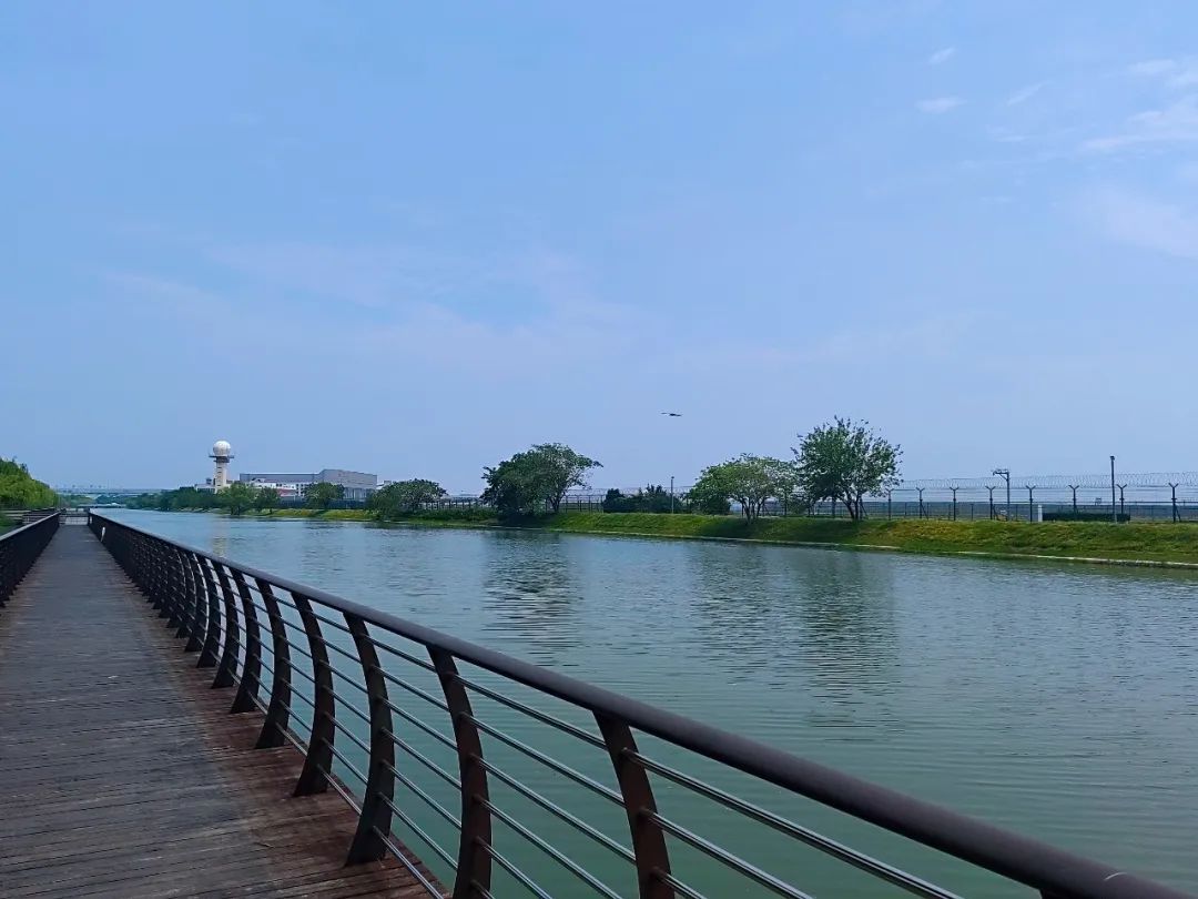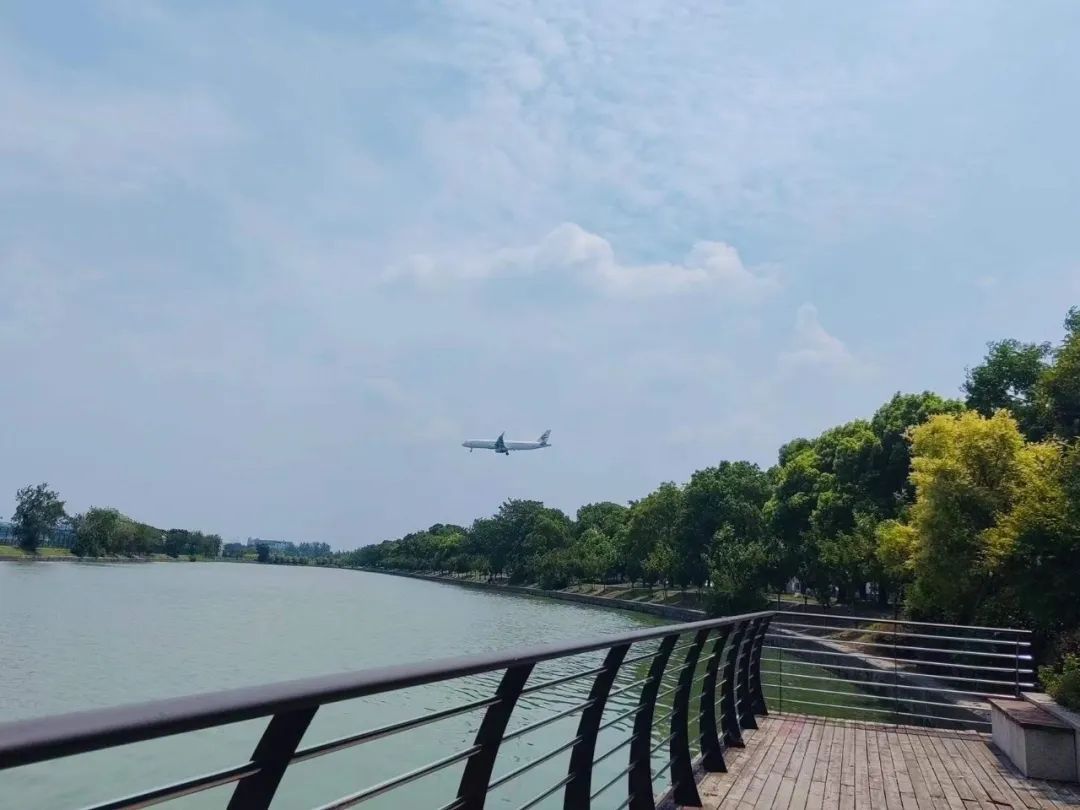 “妈妈,看飞机!”顺着小朋友的声音看过去,一架飞机正在缓缓降落,划过天空,留下一抹白痕。依托虹桥机场的地理优势以及市民爱好看飞机起落的需求,南虹港建起了长达600米的观机长廊,是小有名气的“网红打卡地”。这里有着水路两栖的观机场所,周边还设置了宣传介绍栏。一边赏长天碧水,一边观飞机起落,这样的场景谁不心动。