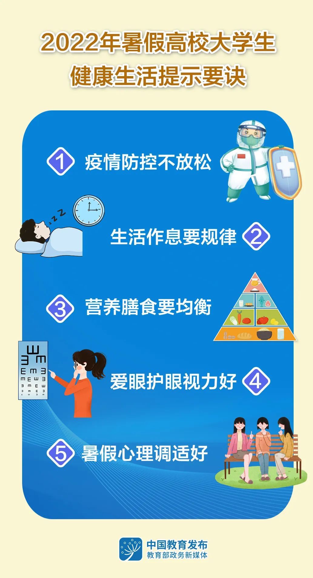 近日,全国高校健康教育教学指导委员会在今年1月发布的《2022年寒假高校大学生健康生活提示要诀》基础上,修订形成《2022年暑期高校大学生健康生活提示要诀》,引导大学生增强“自身健康第一责任人”意识,合理安排暑假期间生活学习,保持身心健康,养成文明健康、绿色环保生活方式。详见↓