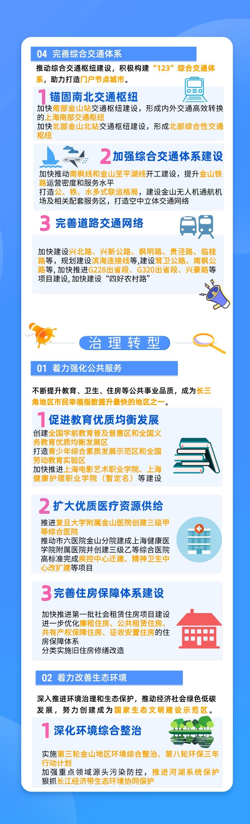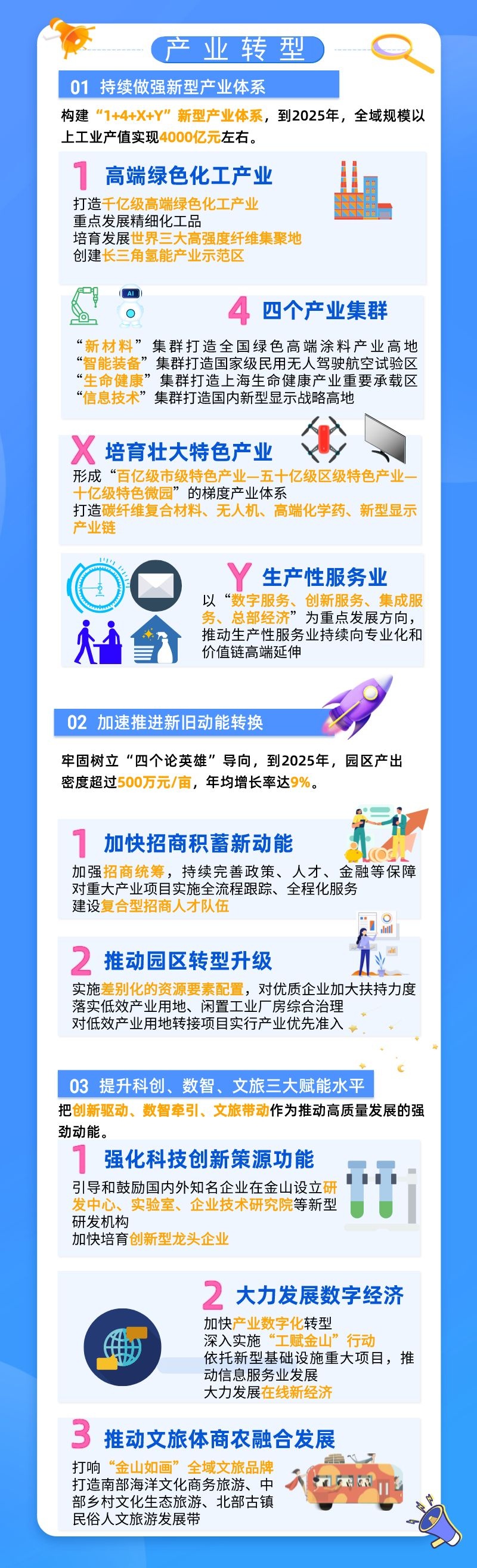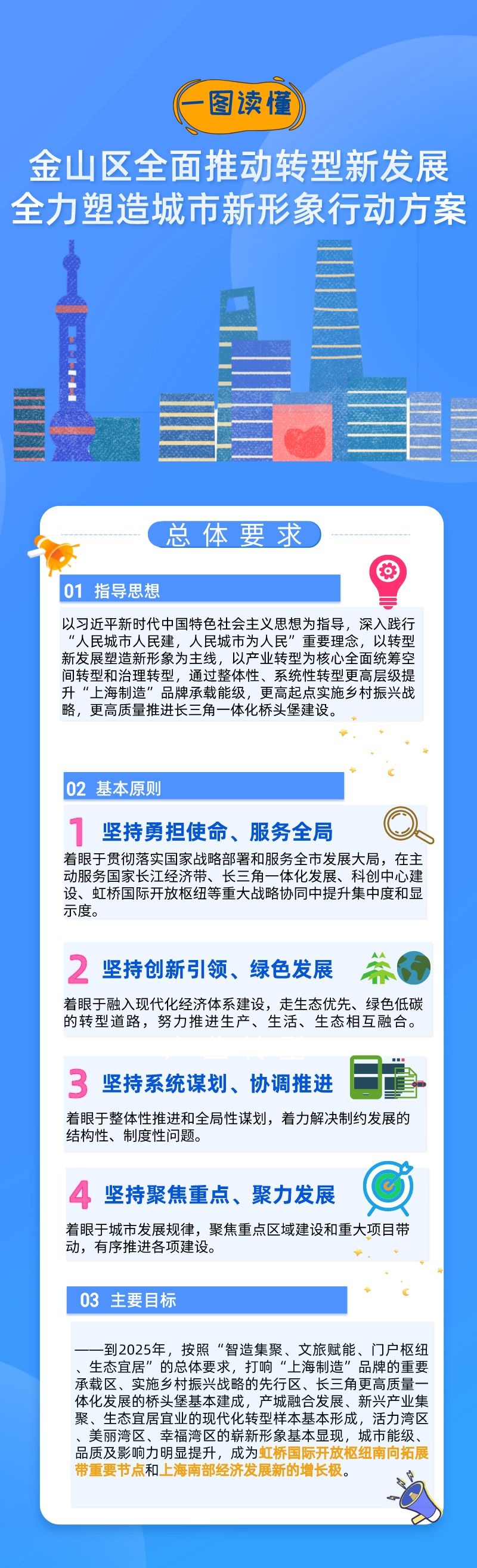 近日,金山区发布《全面推动转型新发展全力塑造城市新形象行动方案》,提出到2025年,按照“智造集聚、文旅赋能、门户枢纽、生态宜居〞的总体要求,打响“上海制造”品牌的重要承载区、实施乡村振兴战略的先行区、长三角更高质量一体化发展的桥头堡基本建成,产城融合发展、新兴产业集聚、生态宜居宜业的现代化转型样本基本形成,活力湾区、美丽湾区、幸福湾区的崭新形象基本显现,城市能级、品质及影响力明显提升,成为虹桥国际开放枢纽南向拓展带重要节点和上海南部经济发展新的增长极,来看图解→
