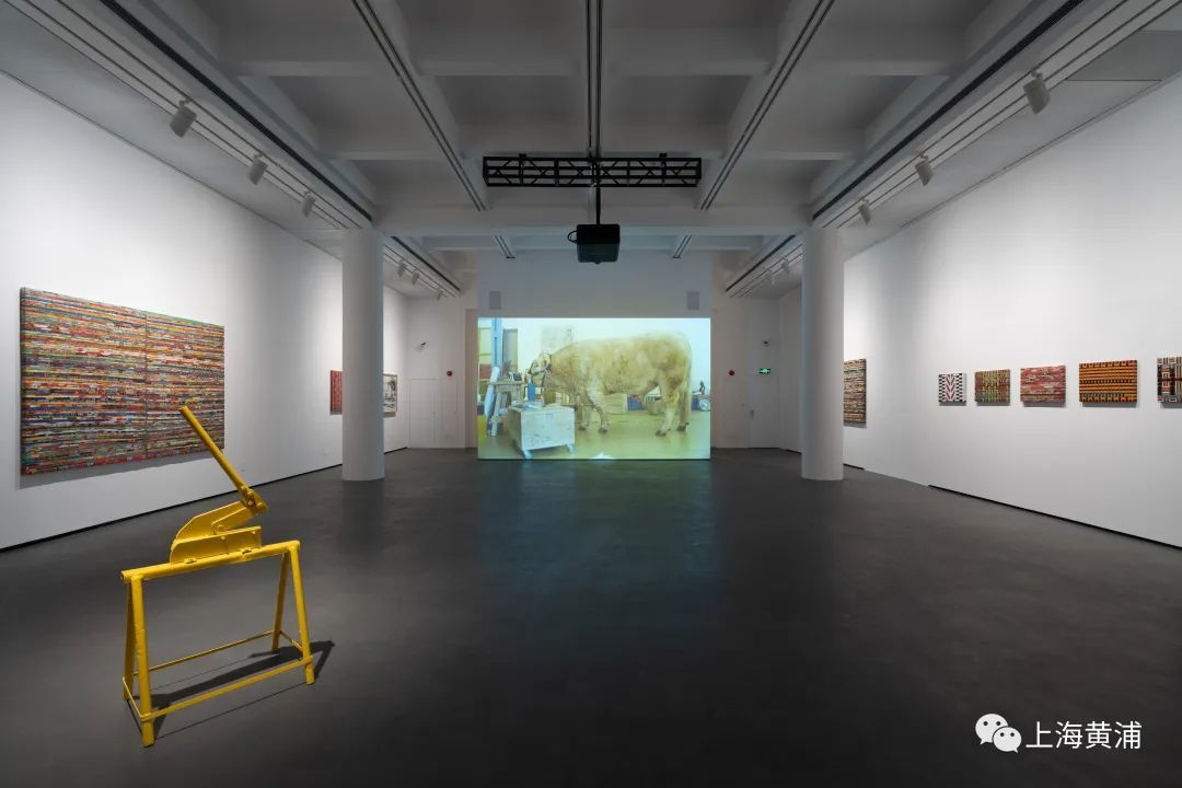 走进美术馆二楼展厅,首先看到的是大型影像作品《工作室,尼尔逊》。一头巨大的白色公牛站在艺术家工作室中,而公牛的周围满是图纸、雕塑部件、工作桌和各种工具。它眼神机警,时而发出些声响,缓慢踱步,试图在不属于自己的地盘上寻找位置。