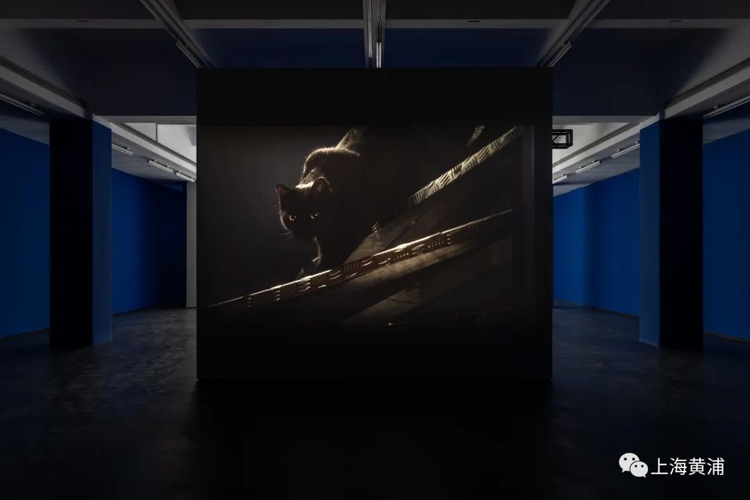 影像作品《一只黑猫从我们之间穿过》在三楼门厅迎接观众的同时,又遮蔽了进入展厅的通道。视频循环播放着一只黑猫在黑暗的空间里走下楼梯。阿德斯梅希望通过捕捉动作瞬 间并循环播放,呈现不加修饰的动态与力量。