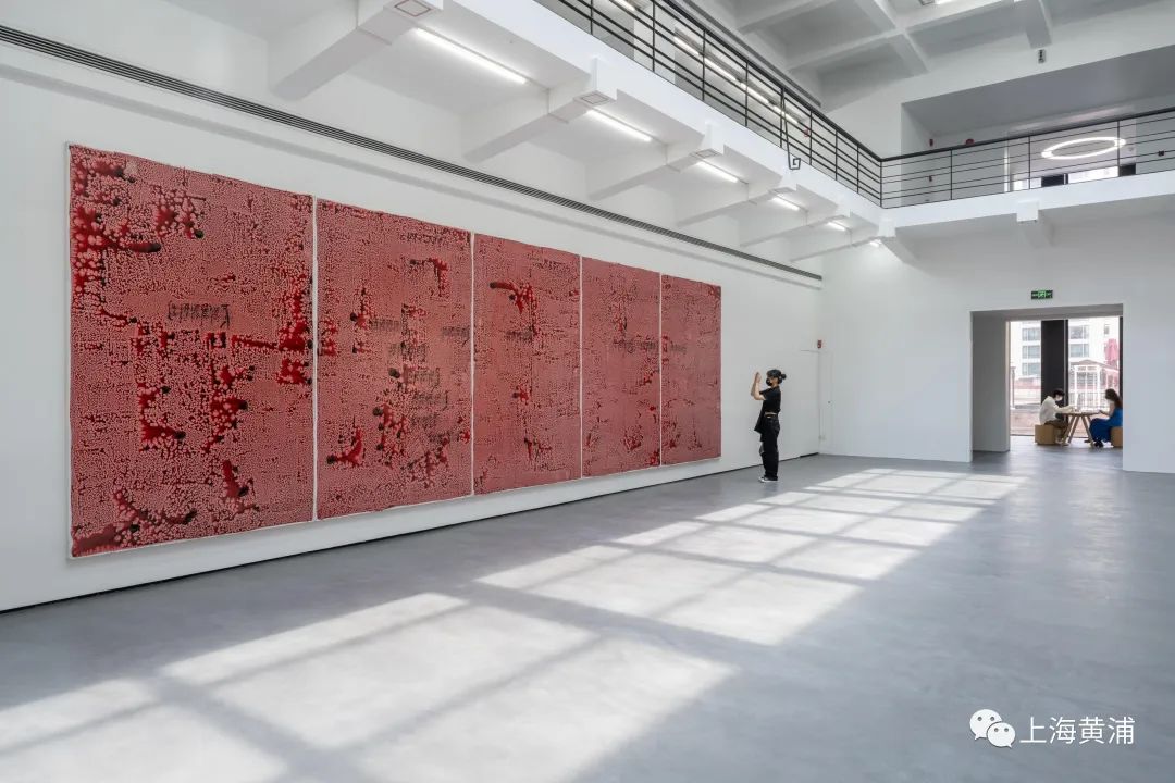 而正对它的,是一幅名为《阿尔及尔 阿尔及尔》的9米长幅画卷,大片的红色起伏之间隐见音符与五线谱。本件作品也是对阿尔及利亚歌手莉莉·博尼切创作的同名流行歌曲的致敬之作,讲述了流亡者缅怀故土和家人的故事。