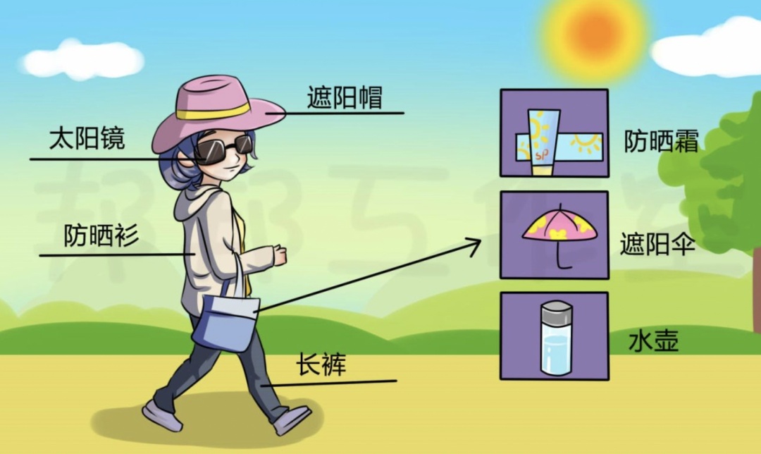 物理防晒有三件宝:伞,帽子和墨镜。一年四季装在包内随身携带能防光过敏、光老化,能明显延缓衰老。