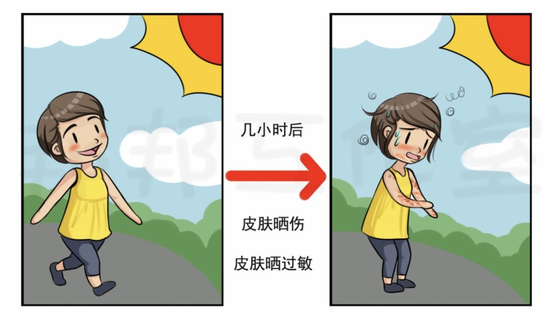 主要是由于暴露皮肤直接受到强烈光线的刺激,引起皮肤的损伤。症状有:照射部位轻的有红斑,脱皮,疼痛感,恢复后留有色素沉着,重的有丘疹、水疱等,有瘙痒或疼痛等。