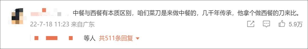 视频中的有关言论引发众多网民不满,有人表示:“中餐与西餐有本质区别,咱们菜刀是来做中餐的,几千年传承,他拿个做西餐的刀来比。”