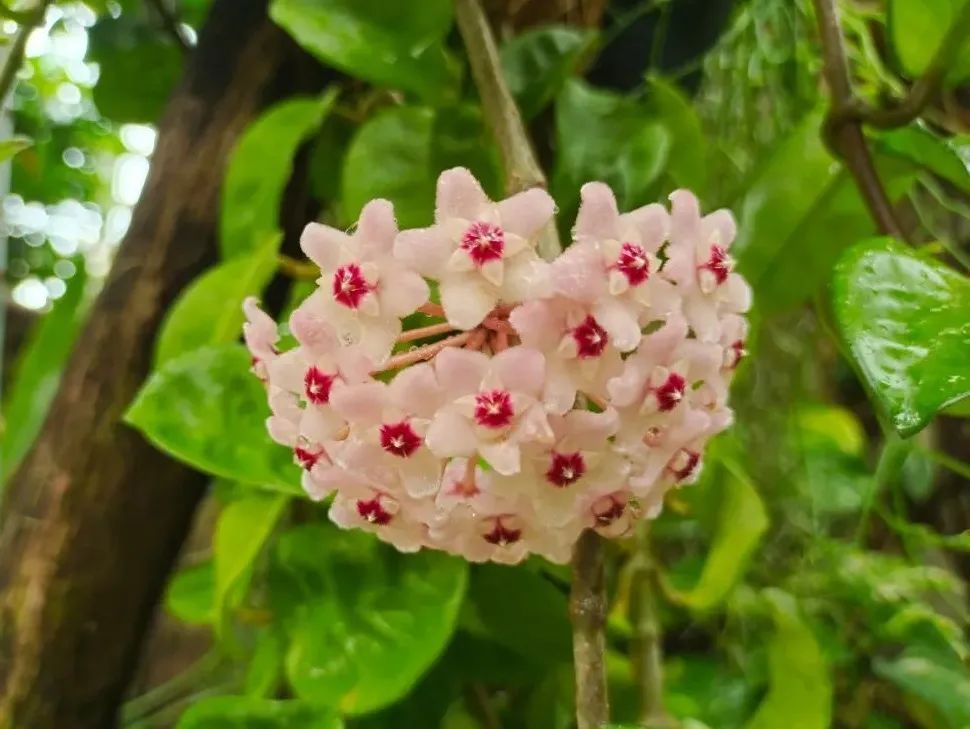 球兰是夹竹桃科球兰属的多年生常绿藤本攀援灌木,常附生于树上或石上,茎节上有气生根,叶肉质。花冠白色星型,密密麻麻地聚集在一起形成伞形的大花球。中间的小花晶莹剔透,惹人怜爱。