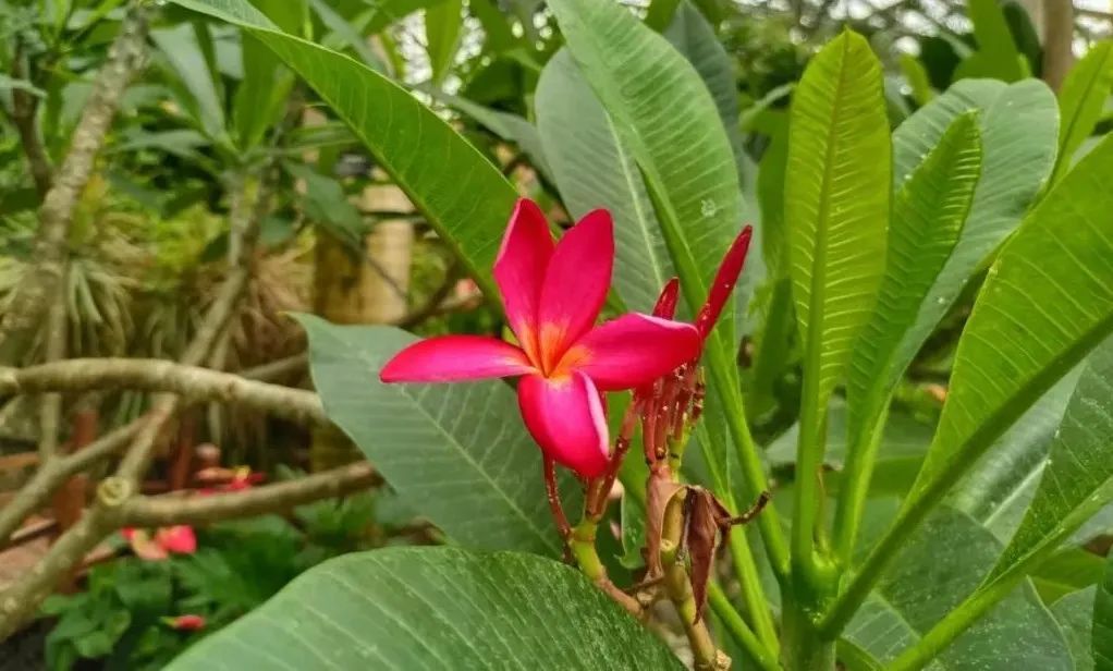 红鸡蛋花是夹竹桃科鸡蛋花属的落叶小乔木,原产于美洲的热带地区。红鸡蛋花的树形美观优雅,落叶后光秃的树干自然弯曲,也有很强的观赏性。花冠筒圆筒形,5片花瓣组成,深红色,基部黄色。花朵除了观赏外,还可以制作美食佳肴。