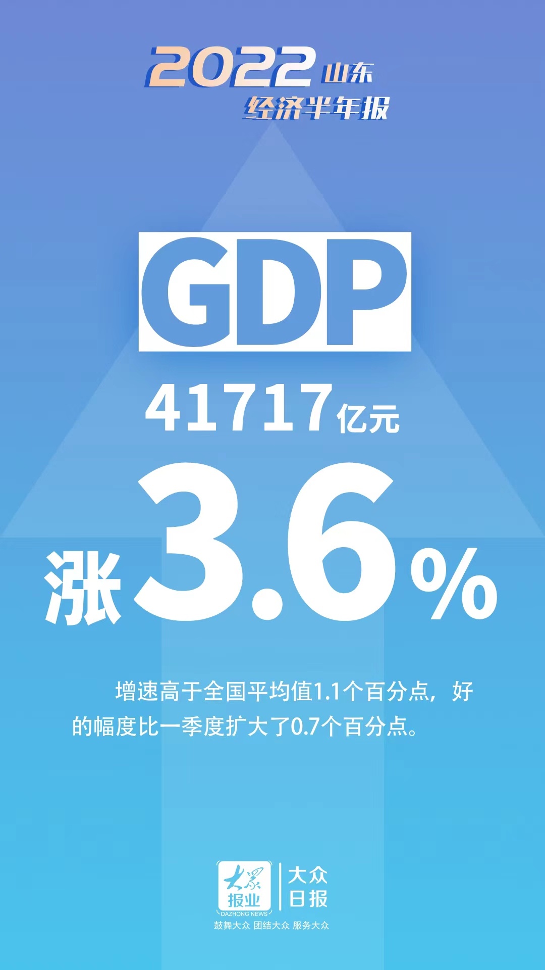 7月19日下午,山东省政府新闻办召开新闻发布会,发布2022年上半年山东经济运行情况。据介绍,上半年山东生产总值为41717亿元,按不变价计算,同比增长3.6%,增速高于全国平均值1.1个百分点,好的幅度比一季度扩大了0.7个百分点。