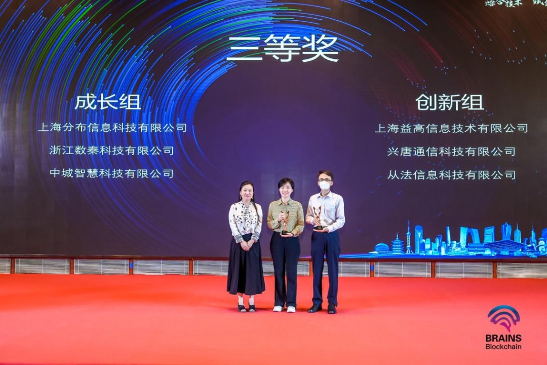 荣获三等奖成长组的是上海分布信息科技有限公司、浙江数秦科技有限公司、中城智慧科技有限公司;荣获三等奖创新组的是上海益高信息技术有限公司、兴唐通信科技有限公司、从法信息科技有限公司。