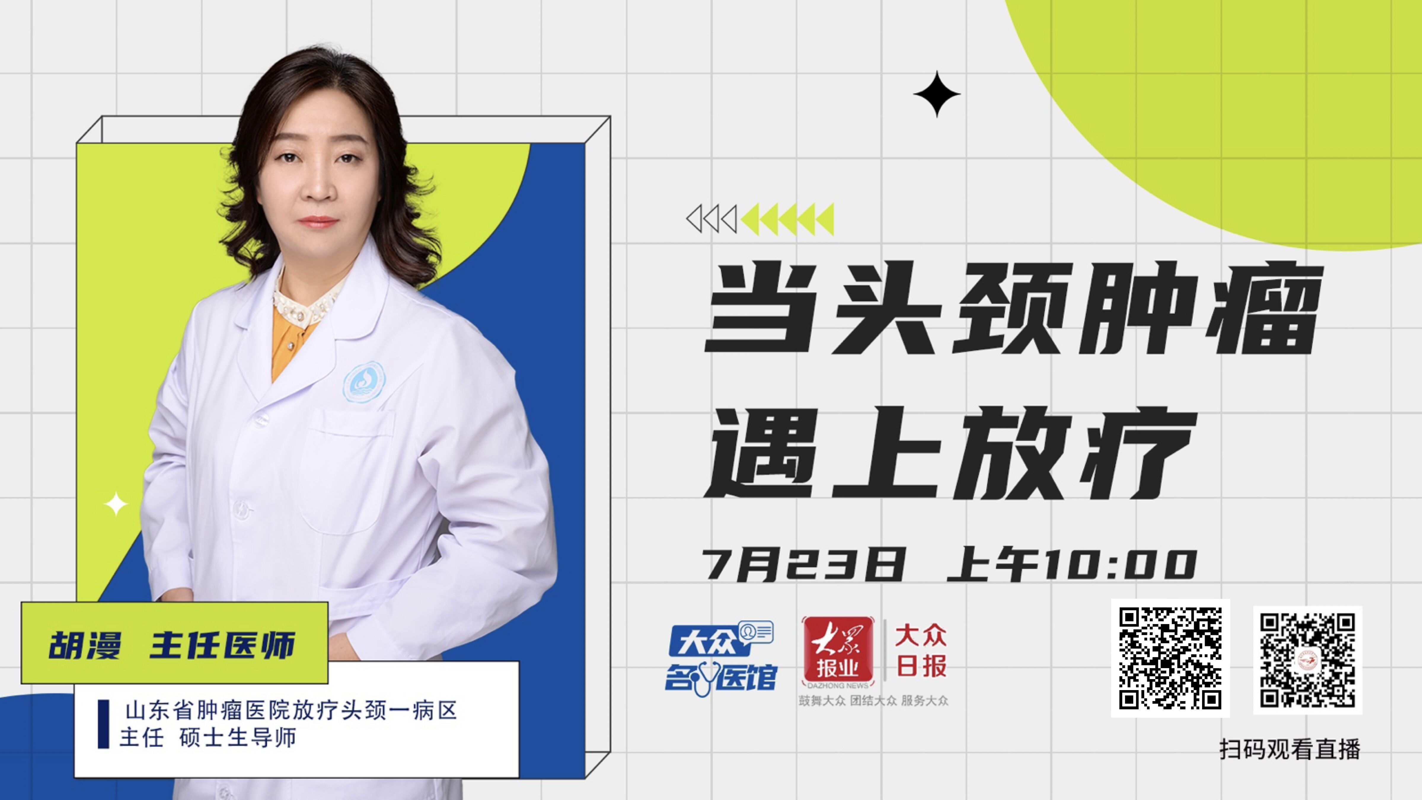 7月23日上午10点,山东省肿瘤医院放疗头颈一病区主任胡漫做客《大众名医馆》,为你答疑解惑。