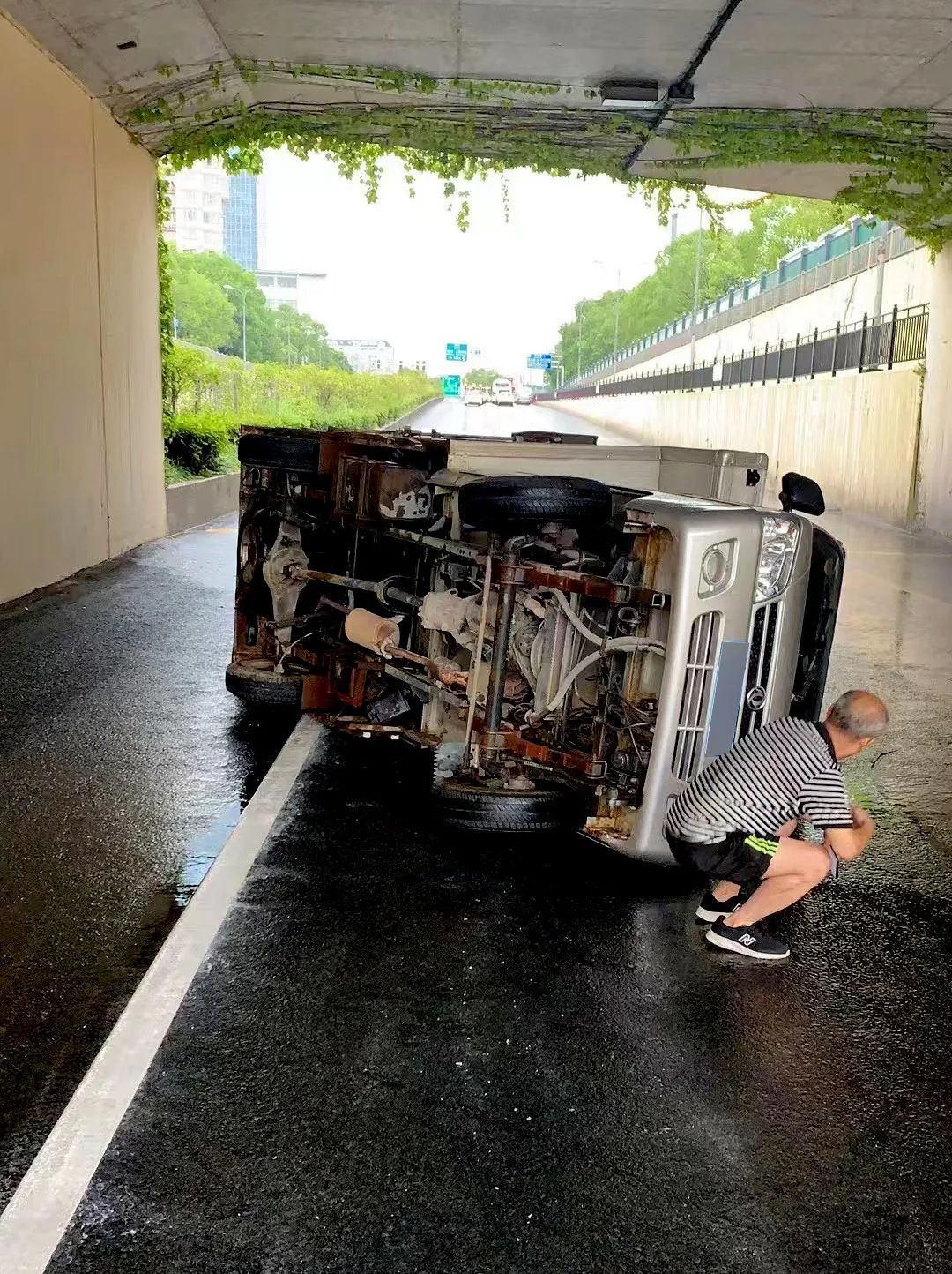 一方面是货车存在超重的情况,另外一方面是因为当时突降暴雨,隧道里有积水,轮胎一打滑,驾驶员操作失误。后续我们也检查了轮胎,轮胎花纹已经比较浅了,驾驶员对于这车辆检查也有疏忽。
