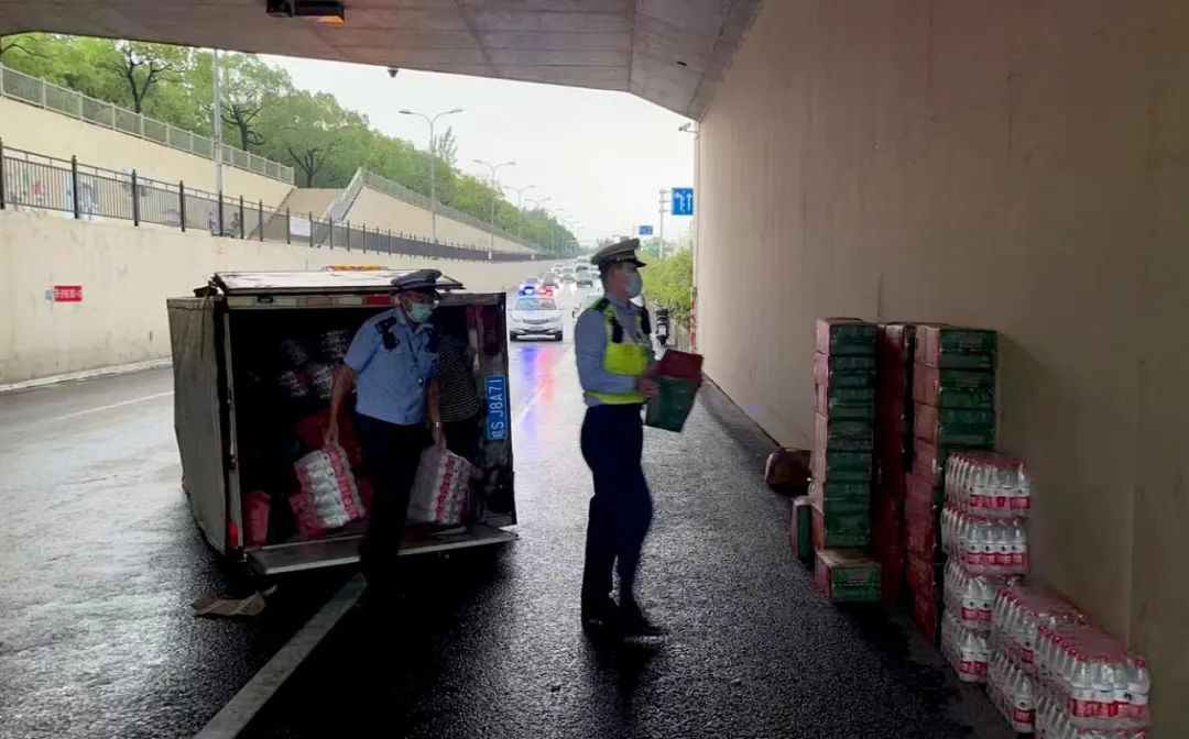 三名交警将车上满载的饮用水一箱箱搬卸至路边,随后再配合牵引车归正事故车辆。经过15分钟的紧张处置,现场交通秩序得到完全恢复,无人员受伤。经初步调查,该起事故因货车超载,在下坡时雨天路滑导致。