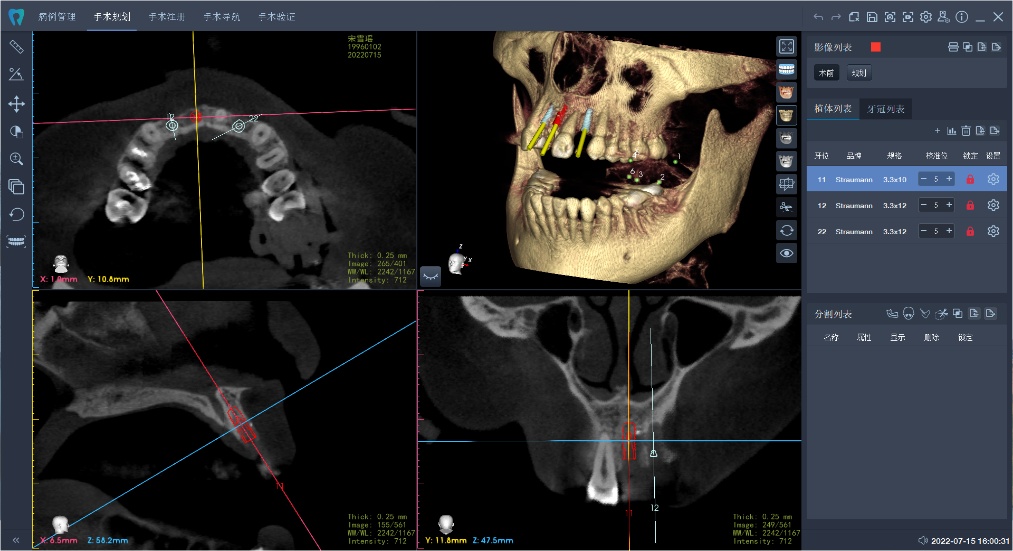 术前,医生将患者的影像学资料导入机器人系统,进行种植体植入全过程的体外可视化模拟,这样手术团队能充分了解患者牙槽骨的骨量及解剖结构走向,更详尽地制订手术方案。