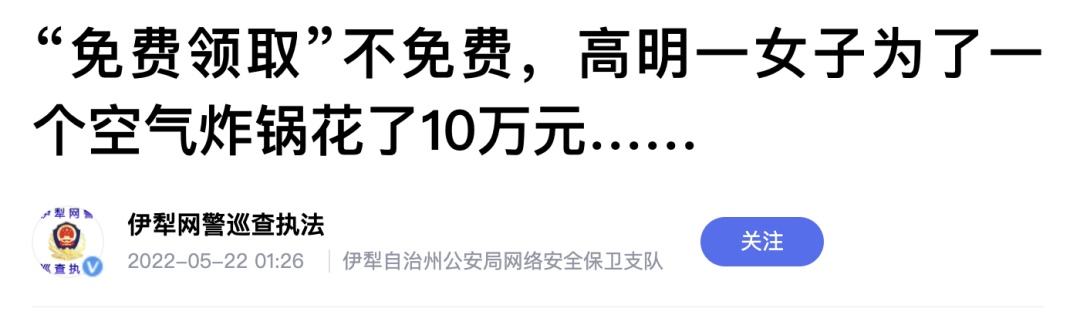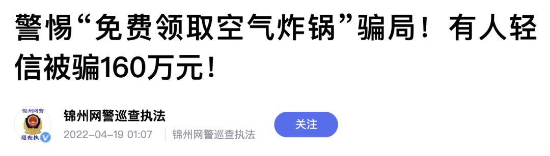 前几天,本小宝发现晒图免费领空气炸锅的骗局又在朋友圈内出现,不少人自认为有一定的防骗知识,抱着试一试又不亏的心态操作了一下,殊不知即便捂住了自己的钱包,你也已经踏进了骗子的陷阱之中,更可能间接成为了行骗的“工具”。