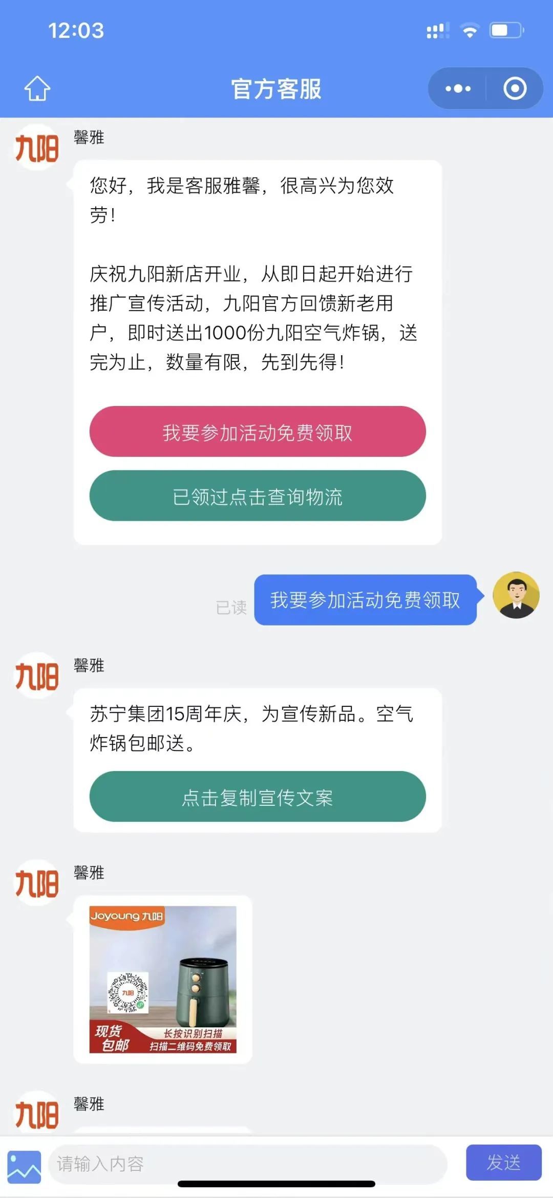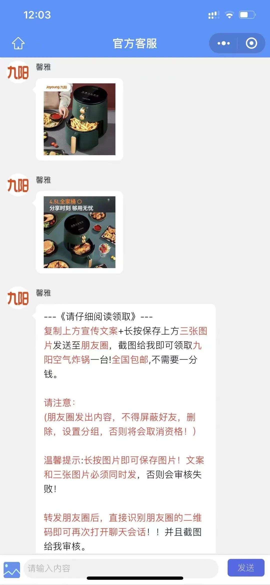 通过点击短信链接、识别微信广告页面二维码,你会进入一个客服聊天页面。在确认是参加免费领空气炸锅活动后,商家客服(骗子)会给你一个宣传文案,基本都是“庆祝XX集团周年庆(新店开业),为宣传新品空气炸锅包邮免费送”类似字样,以及几张图片,要求你用这些文字及图片发一条朋友圈并截图。