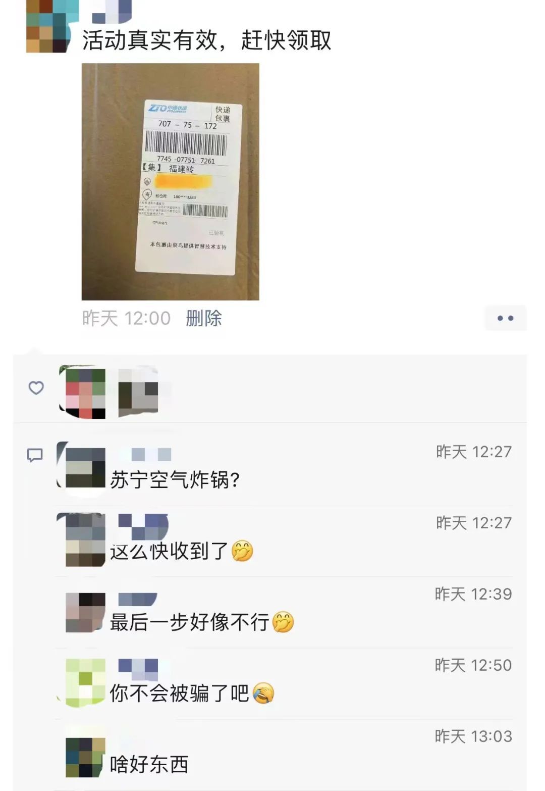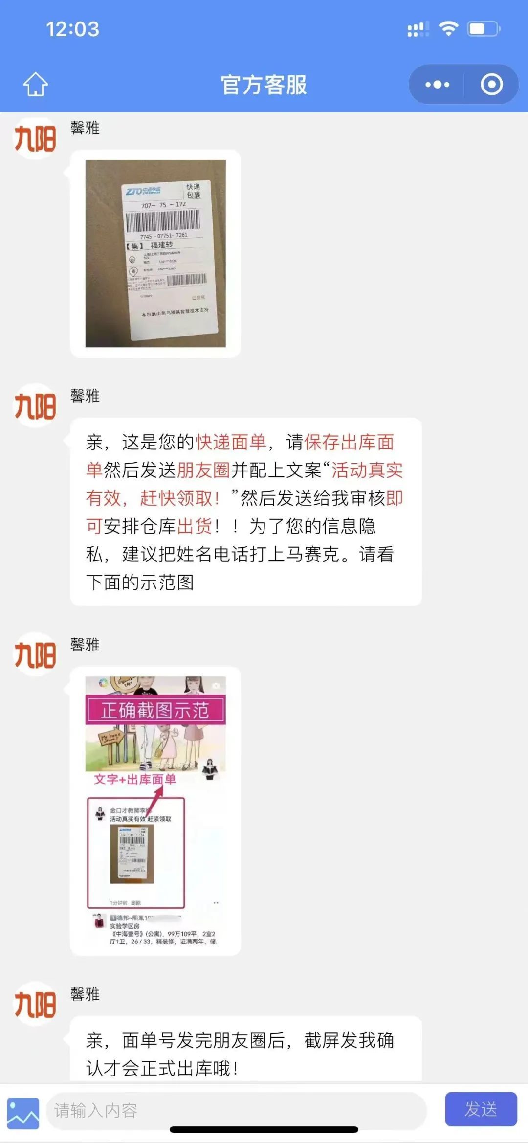 在发了第一条朋友圈后,客服会问你要取姓名、地址、电话等个人信息,不一会儿一张标注你个人信息的快递单据截图(自行打印的假单据)就会出现在面前。此时对方会要求你将这张截图再次发到朋友圈,并附上“活动真实有效,赶快领取”类似字样。