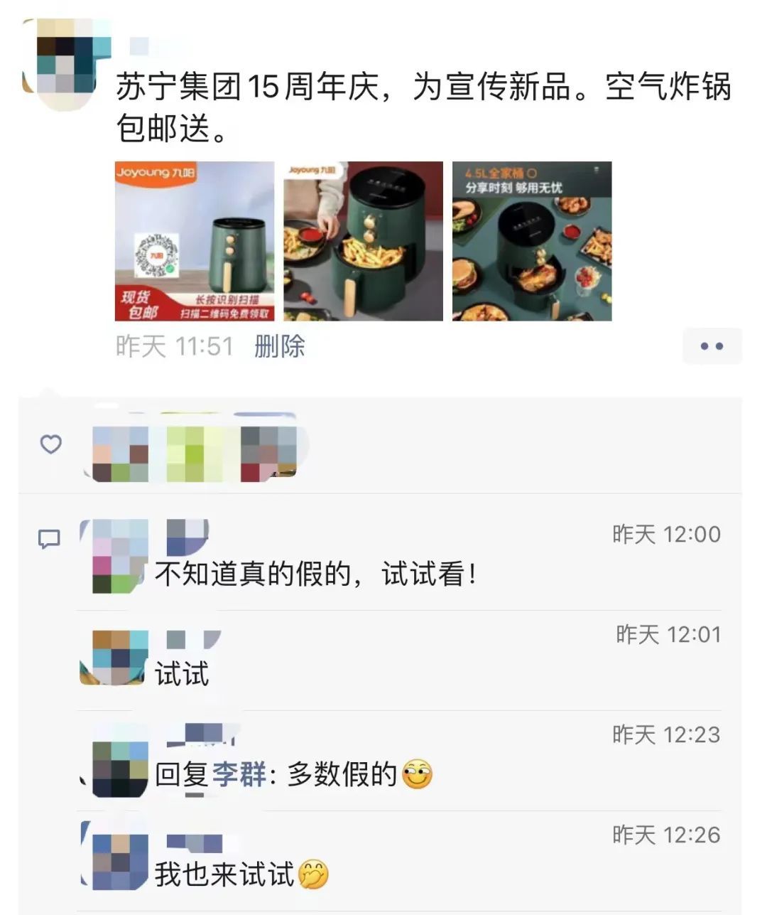 在你按照上述两步发完朋友圈后,对方就会说已经满足领取要求,只要两条朋友圈保持数小时后空气炸锅即可发货。而等待期间,客服会拉你进一个空气炸锅“交流群”,接下来就会在群里发布刷单任务,正式开始刷单赚佣金的诈骗局。