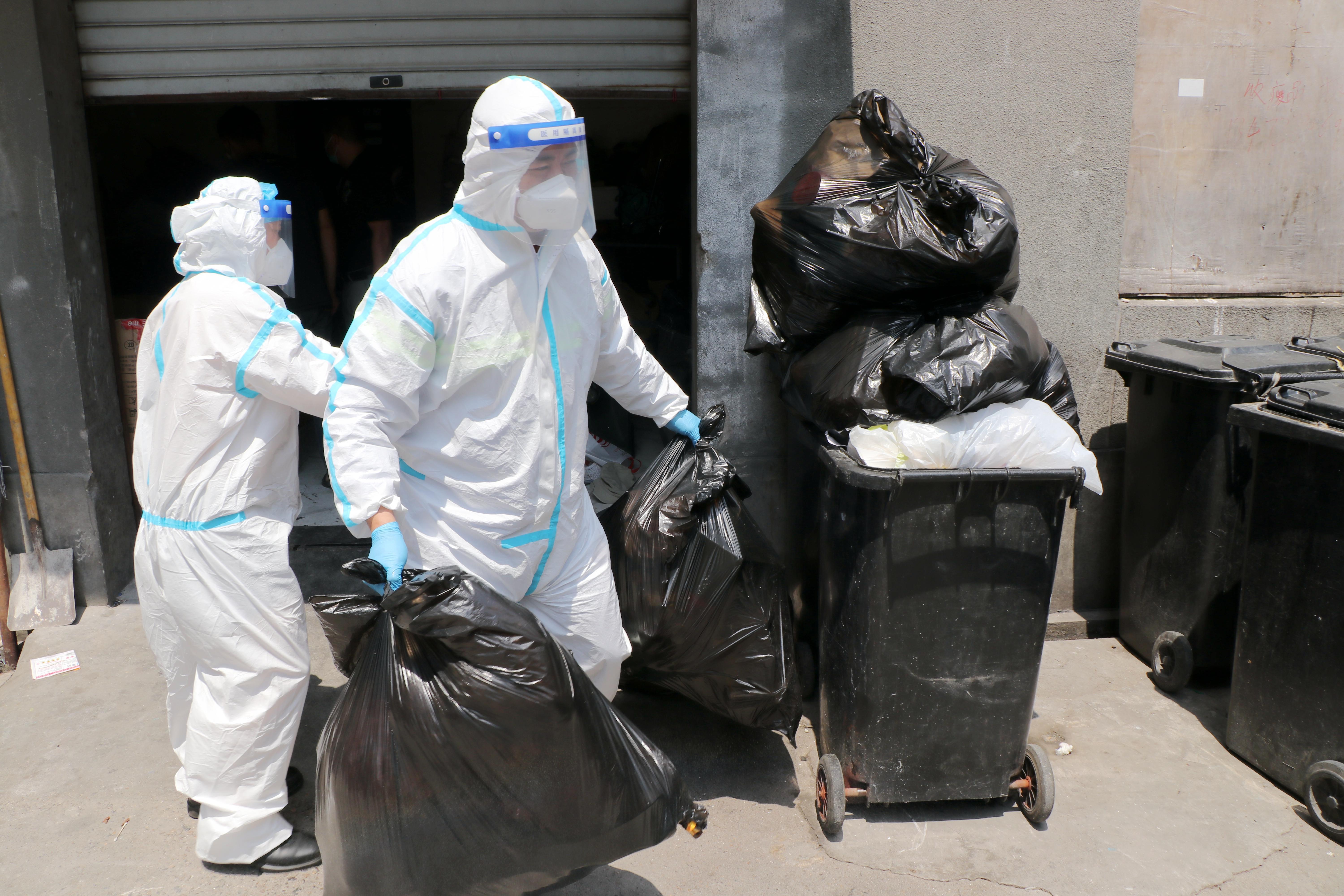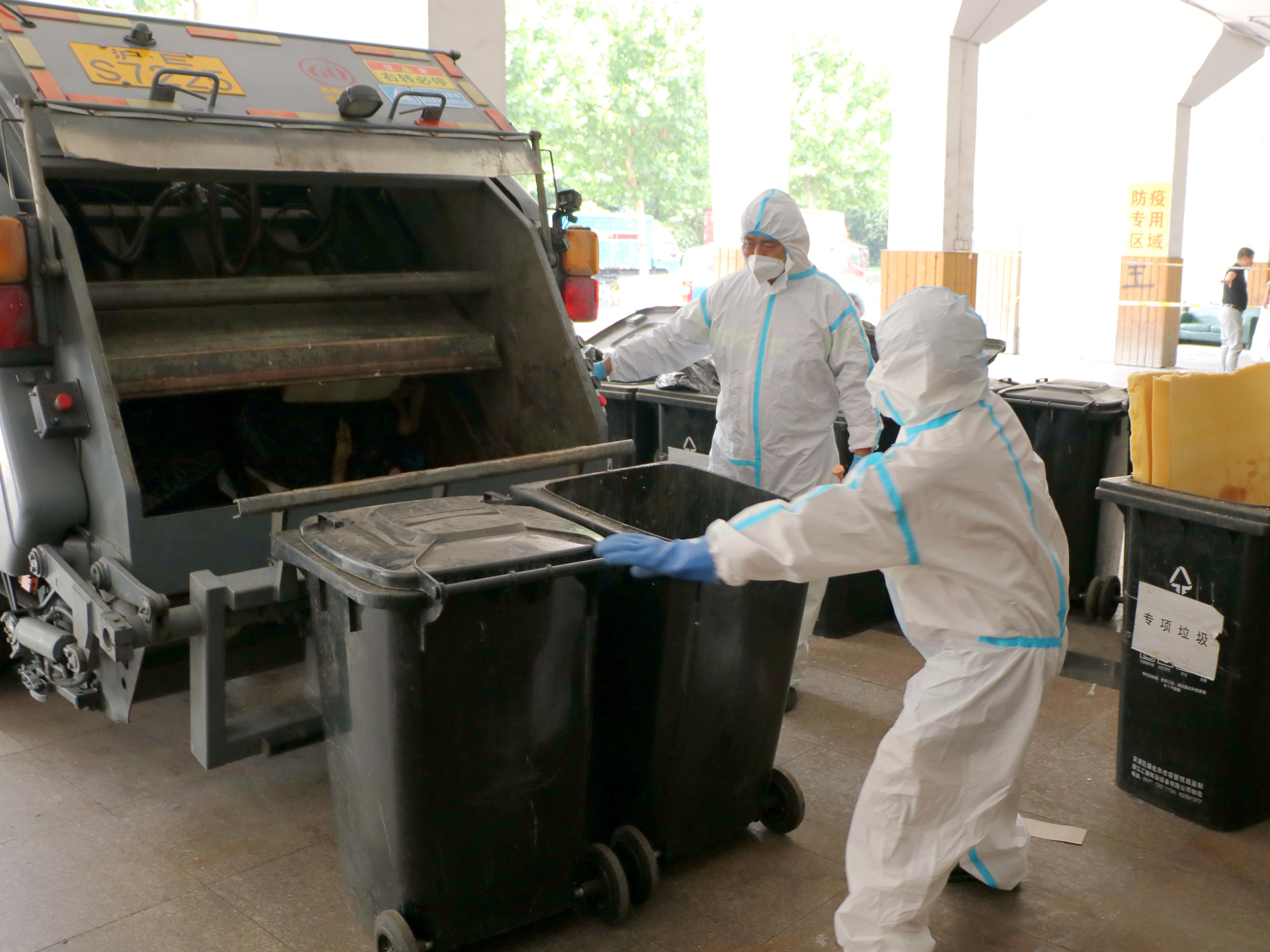 李绍杰驾驶作业车辆到达专项垃圾收运作业点,首先按照规定收运流程,对专项垃圾进行全面消杀。随后,在保证作业安全的情况下,将一袋袋垃圾放入作业车辆。为避免破袋风险,他们轻轻拿起、高高托起、再缓缓放下。不到5分钟,两位师傅就已满头大汗,防护服里面的衣服也湿了一大半。他们迅速完成垃圾收运,对作业车辆再次进行喷洒消毒后,继续赶往下一个点位。