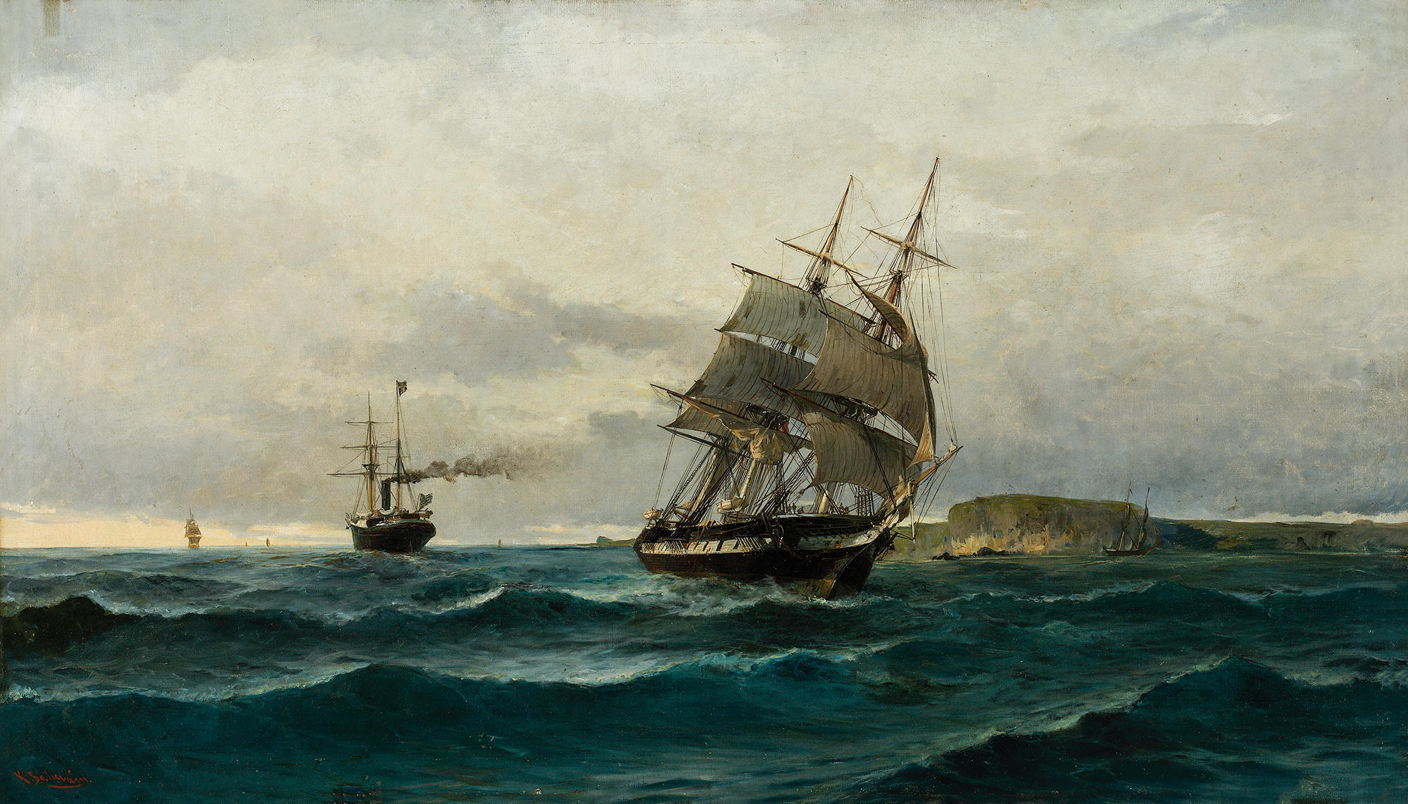 其中就包括了希腊杰出的海洋画家康斯坦丁诺斯·沃拉纳基斯的作品《海景》——汹涌的海面上并列航行着两艘不同的船只:一艘帆船和一艘蒸汽船。蒸汽船在构图的对角线上驶向远方,而同一航线上的帆船则位于前景,正面向观众驶来。艺术家细微而清晰地描绘了这艘帆船,它在波涛起伏的海面上展开风帆,船身倾斜,昏暗的色调与柔和的光线用来表现海上的恶劣天气。