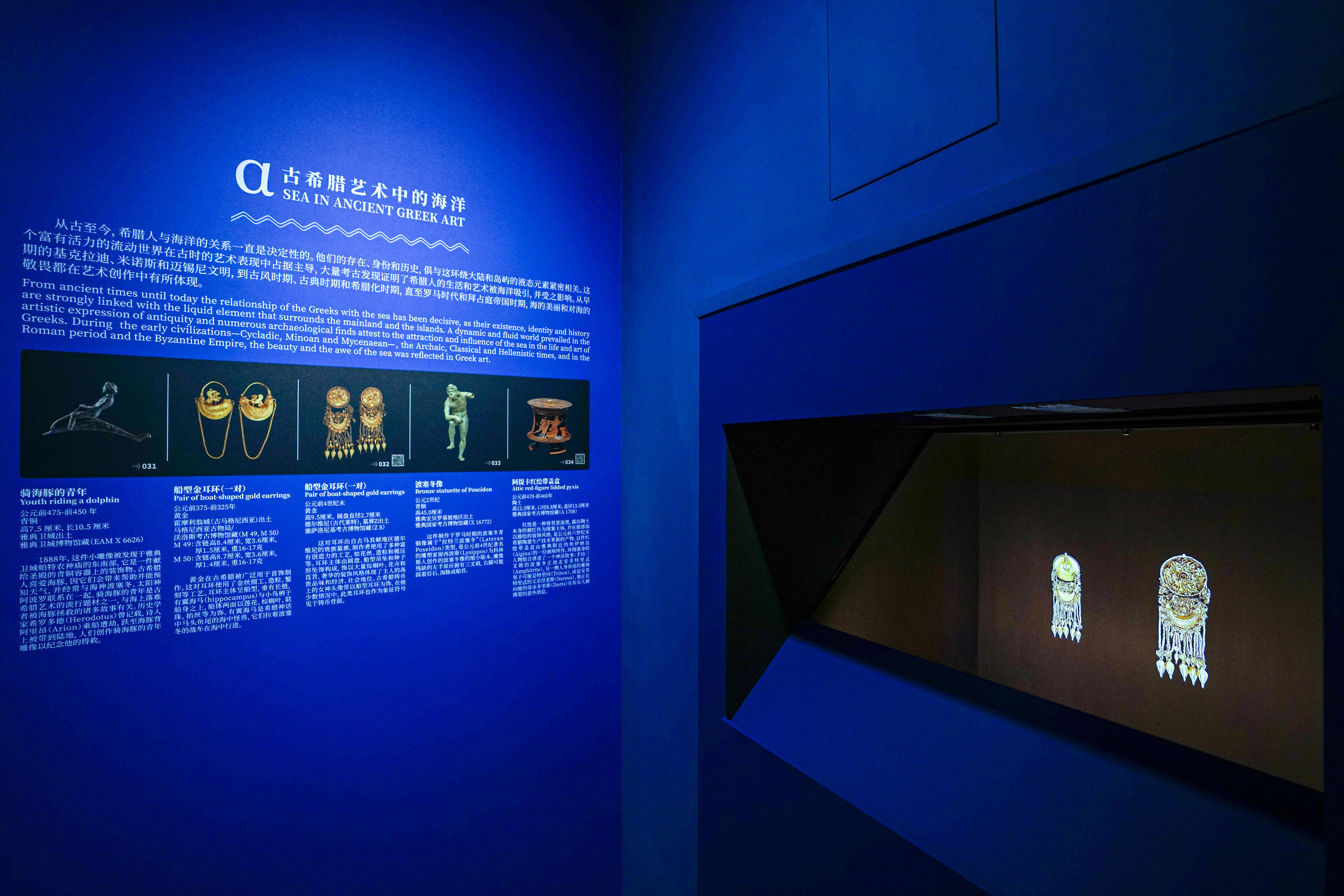 “古希腊艺术中的海洋”板块展示了5件全息投影的古希腊文物。这一板块原有12件古希腊文物,受疫情影响,主办方将其调整为使用全息投影技术的5件文物以虚拟呈现方式参展,其中包括雅典卫城博物馆所藏青铜雕像《骑海豚的青年》、马格尼西亚古物局/沃洛斯考古博物馆所藏船型金耳环(一对)、塞萨洛尼基考古博物馆所藏船型金耳环(一对),以及雅典国家考古博物馆所藏青铜雕像《波塞冬像》和阿提卡红绘带盖盒。