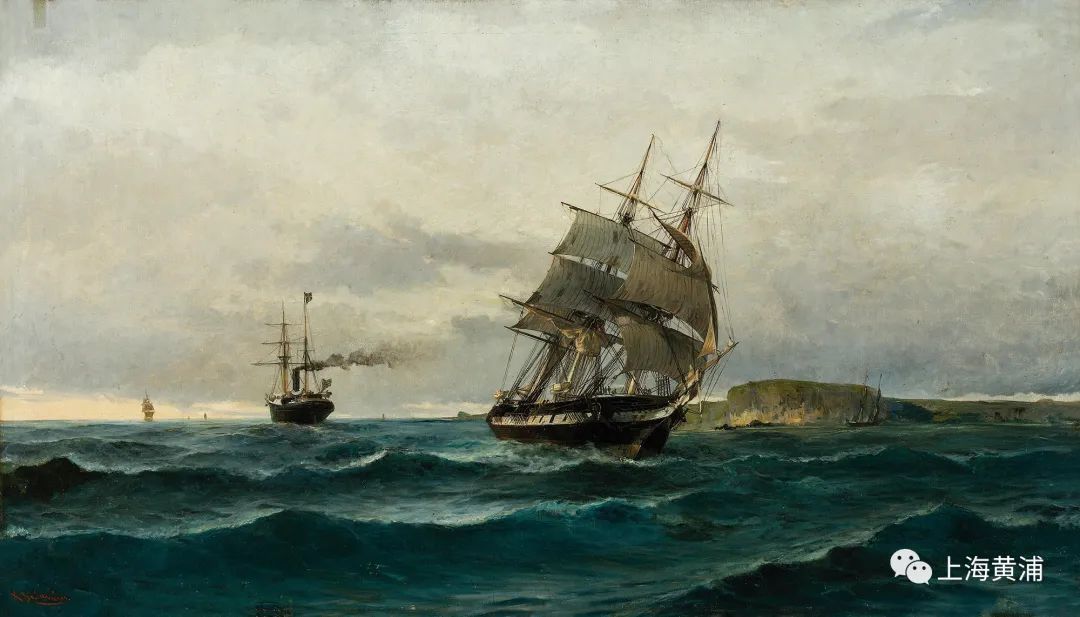 其中就包括了希腊杰出的海洋画家康斯坦丁诺斯·沃拉纳基斯的作品《海景》——汹涌的海面上并列航行着两艘不同的船只:一艘帆船和一艘蒸汽船。蒸汽船在构图的对角线上驶向远方,而同一航线上的帆船则位于前景,正面向观众驶来。艺术家细微而清晰地描绘了这艘帆船,它在波涛起伏的海面上展开风帆,船身倾斜,昏暗的色调与柔和的光线用来表现海上的恶劣天气。