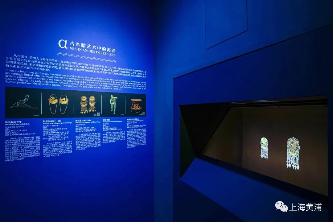 “古希腊艺术中的海洋”板块展示了5件全息投影的古希腊文物。这一板块原有12件古希腊文物,受疫情影响,主办方将其调整为使用全息投影技术的5件文物以虚拟呈现方式参展,其中包括雅典卫城博物馆所藏青铜雕像《骑海豚的青年》、马格尼西亚古物局/沃洛斯考古博物馆所藏船型金耳环(一对)、塞萨洛尼基考古博物馆所藏船型金耳环(一对),以及雅典国家考古博物馆所藏青铜雕像《波塞冬像》和阿提卡红绘带盖盒。