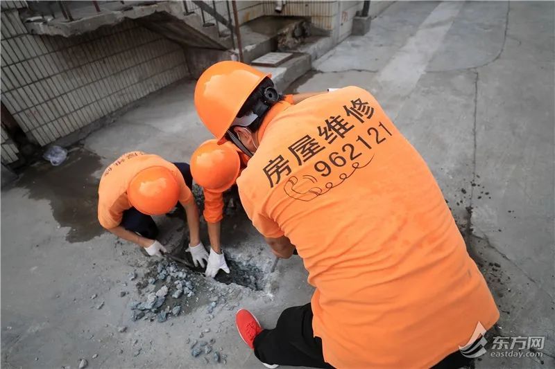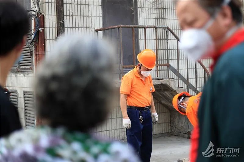 7月19日早上8点多,永业集团永善公司的师傅们就来到打浦大楼楼下,翻排雨水管。把水泥路面挖开后,师傅发现原先那根老旧的雨水管已经断裂,若不及时更换,将会在下雨天形成积水。今天上海虽然没有冲刺高温线,但站在室外没两分钟就开始汗如雨下。师傅们蹲在地上工作,每个人的橙色工作服背后都湿掉一大片。