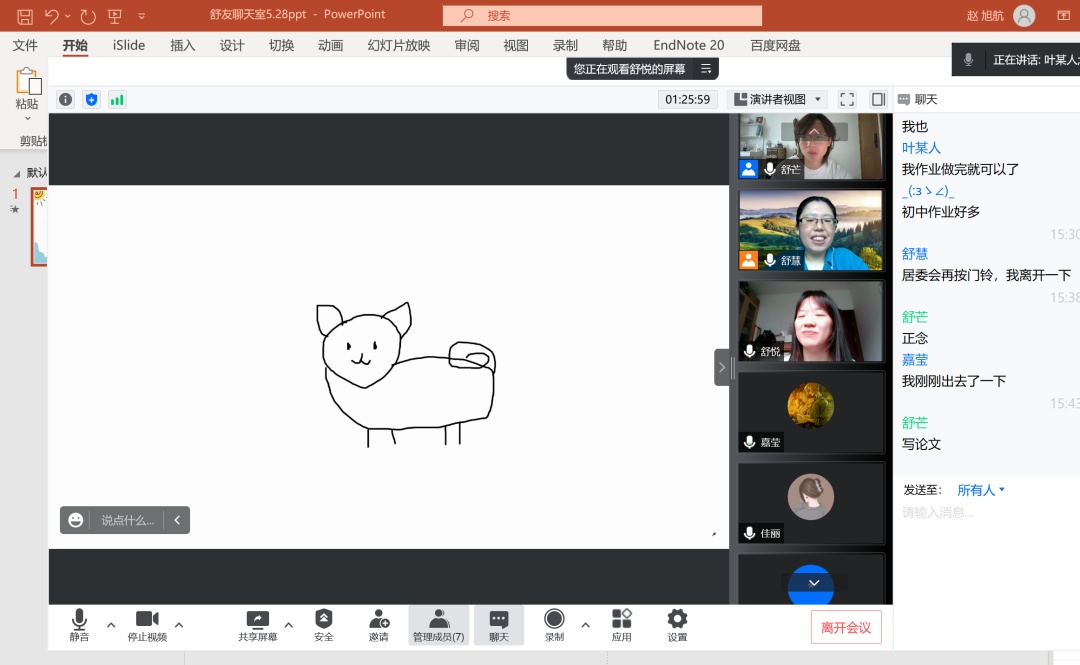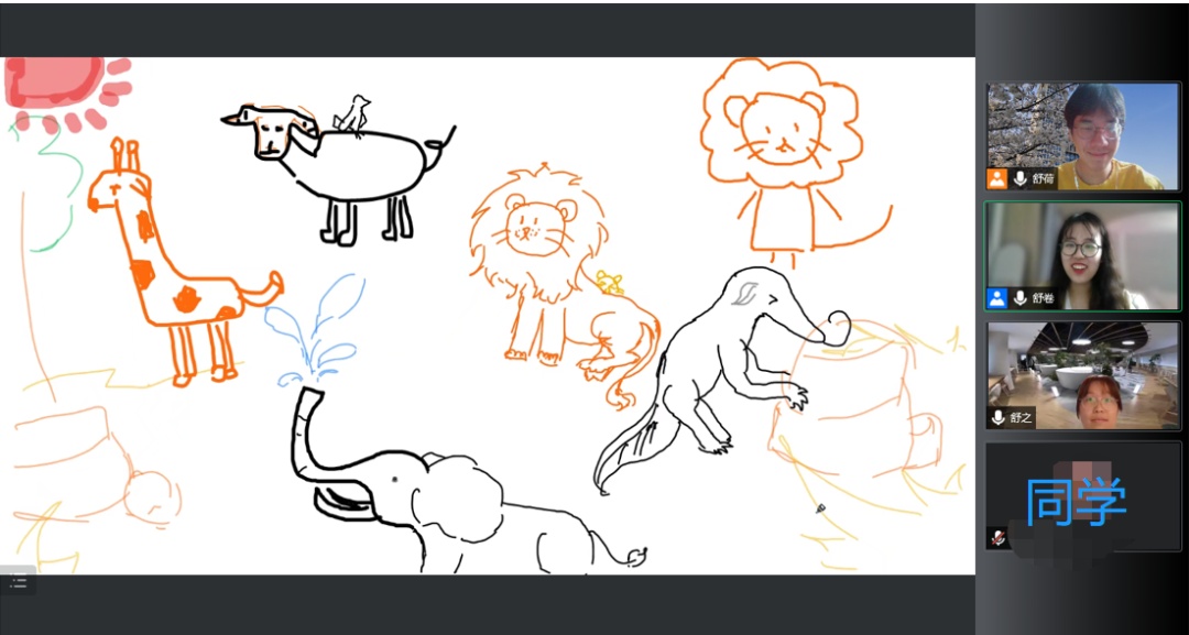 “假如你有时光机,最想穿越到过去或未来哪个时刻?”“你认为好朋友应该具备的三个标准是?”“今天我们都是线上绘画大师!”……考虑到刚进入聊天室的孩子们会感到陌生和胆怯,聊天室允许孩子们可以不打开话筒和摄像头,仅用打字完成互动,直到卸下心防。