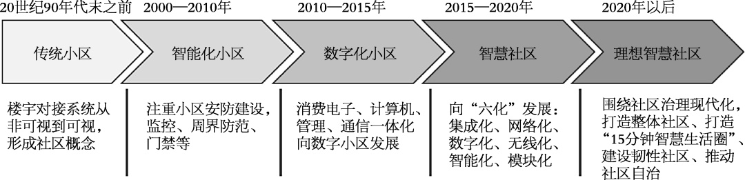 社区作为城市的基本单元,是人民赖以生存的生活空间和精神家园。中国的智慧社区发展始于20世纪90年代末,经过不同时期的技术赋能与发展,已然抵达“理想智慧社区”。
