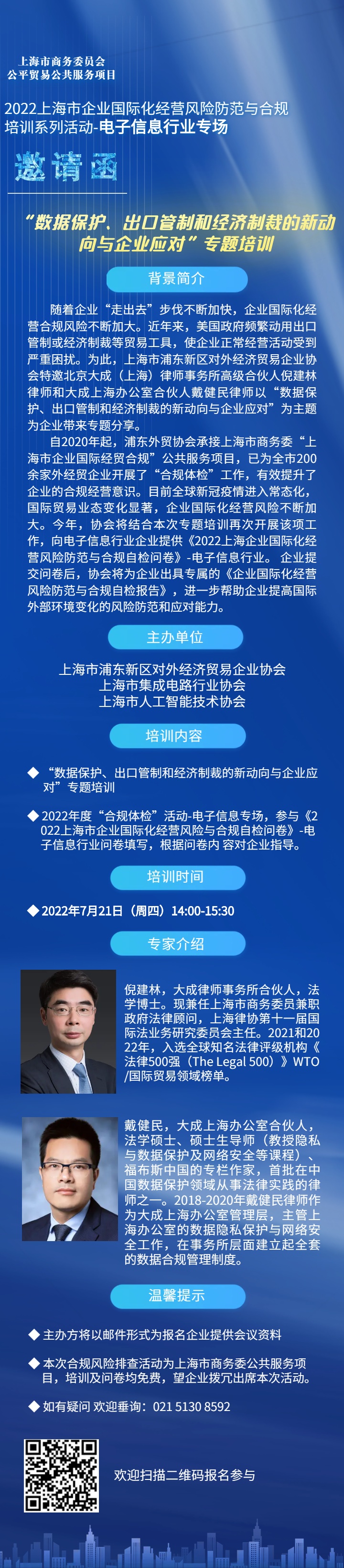 7月21日14点,上海市浦东国际商会特邀北京大成(上海)律师事务所高级合伙人倪建林律师和大成上海办公室合伙人戴健民律师以“数据保护、出口管制和经济制裁的新动向与企业应对”为主题为企业带来专题分享。