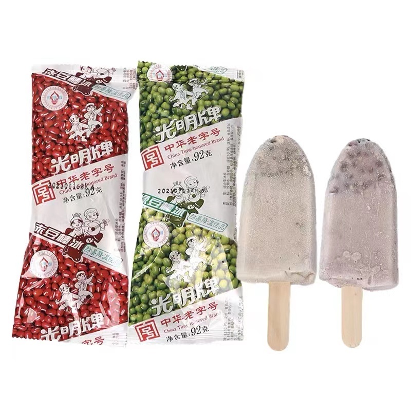 光明赤豆棒冰、绿豆棒冰这对cp也火了很多年了,外表虽然看上去质朴,却天然不含色素,上半截是满满的豆子,下半截是纯纯的豆汤滋味,就像小时候在外婆家喝那碗绿豆汤、红豆汤的味道。