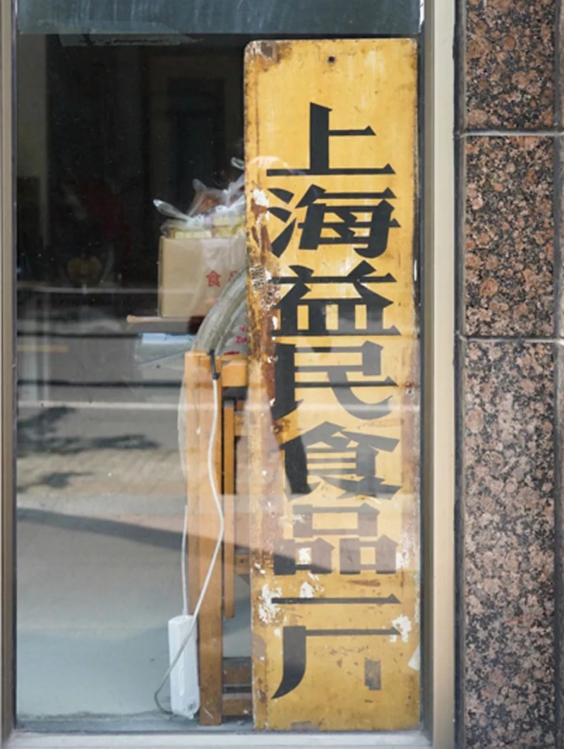 门口有一块写着“上海益民食品一厂”的木牌子,斑驳的痕迹彰显着它的年纪。