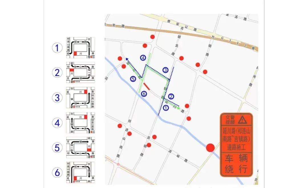 施工期间,延川路(自西向东往吉镇路方向)临时改道方案为:在祁连山南路左转,至绥一路右转,随后前往吉镇路方向。目前绥一路(祁连山南路-吉镇路)已划定双向单车道通行。