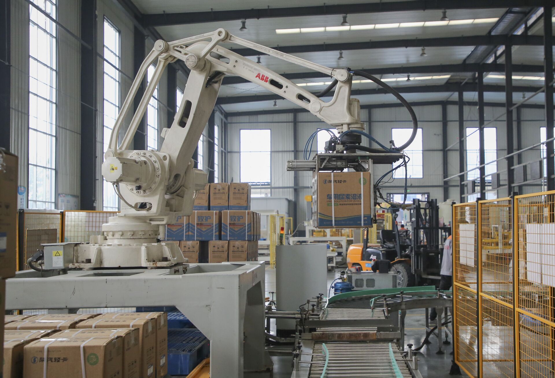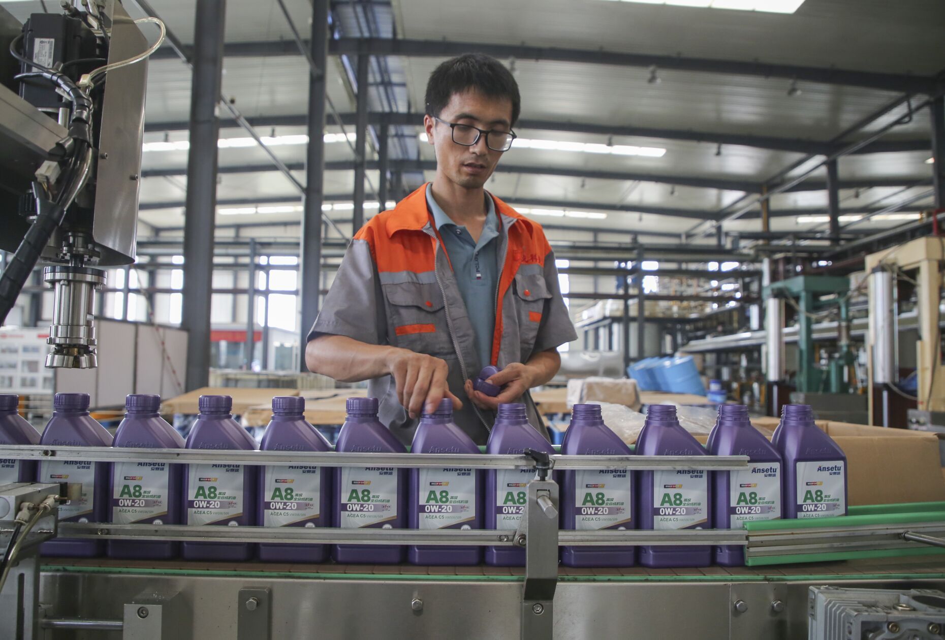 在山东莱克科技有限公司车间,工人正在生产线上生产高端润滑油,智能机械臂高速搬运出厂产品。山东莱克年产20万吨高端润滑材料,获得奔驰、宝马等27个全球著名发动机生产厂的国际认证。