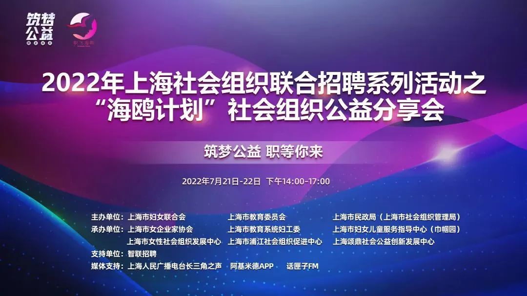 为积极应对疫情对就业的冲击和影响,充分体现上海社会组织的责任担当,上海市民政局会同相关单位发起了“筑梦公益”上海市社会组织联合招聘系列活动,作为系列活动之一,社会组织公益分享会在市妇联、市教委、市民政的共同指导下开展,依托上海市女大学生职业飞翔“海鸥计划”,通过线上专场招聘、主题宣讲等形式,多渠道、多维度助力大学生就业。