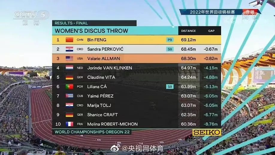 决赛共有6轮,前三轮过后淘汰四名选手,其余8人还有3次试投的机会。选手们都在奋力追赶冯彬的成绩,紧随她身后的是两位名将:两届奥运会冠军克罗地亚的佩尔科维奇,东京奥运会冠军美国的奥尔曼。两位选手都投出了68米以上的成绩,与冯彬很是接近。