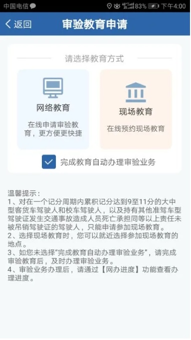 在一个记分周期内记分为1至8分的(包括8分)的大中型客货车驾驶人,可直接选择“网络教育”在线自主学习。