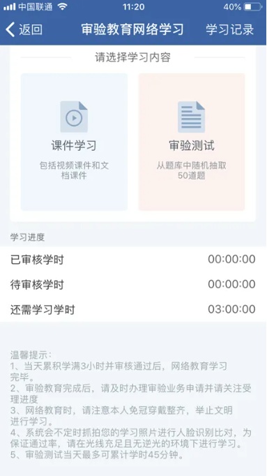 驾驶人选择参加网络审验教育的,应在线学习不少于3小时,审核通过后,视为完成审验教育。为确保驾驶人本人持续在线接受教育,系统将随机抓拍学习照片进行人脸比对,人脸比对不通过的,当天学习记录作废。