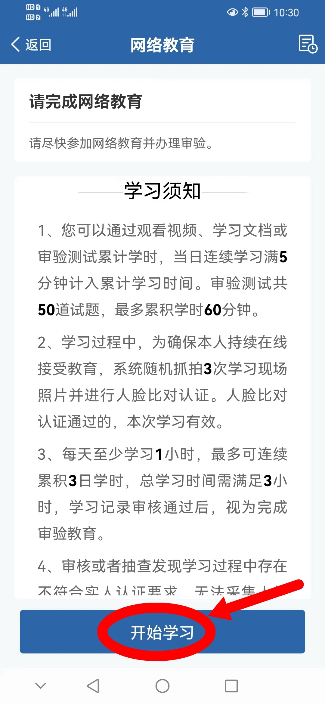 参加审验教育网络学习时,不得从事与学习无关的事项,要确保手机屏幕在视线正前方,存在替学情形的取消本次教育资格。