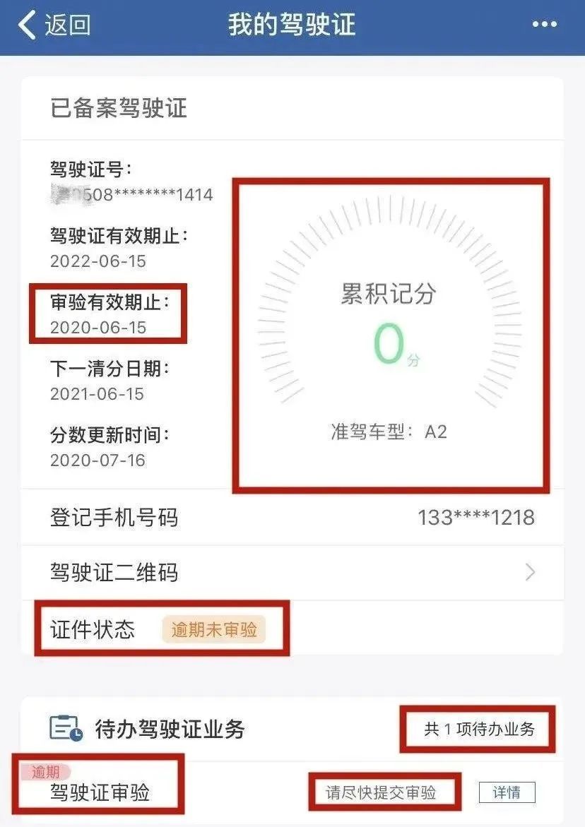 如果驾驶证状态为逾期未审验时,您需要立即进行审验,且不能开车上路。