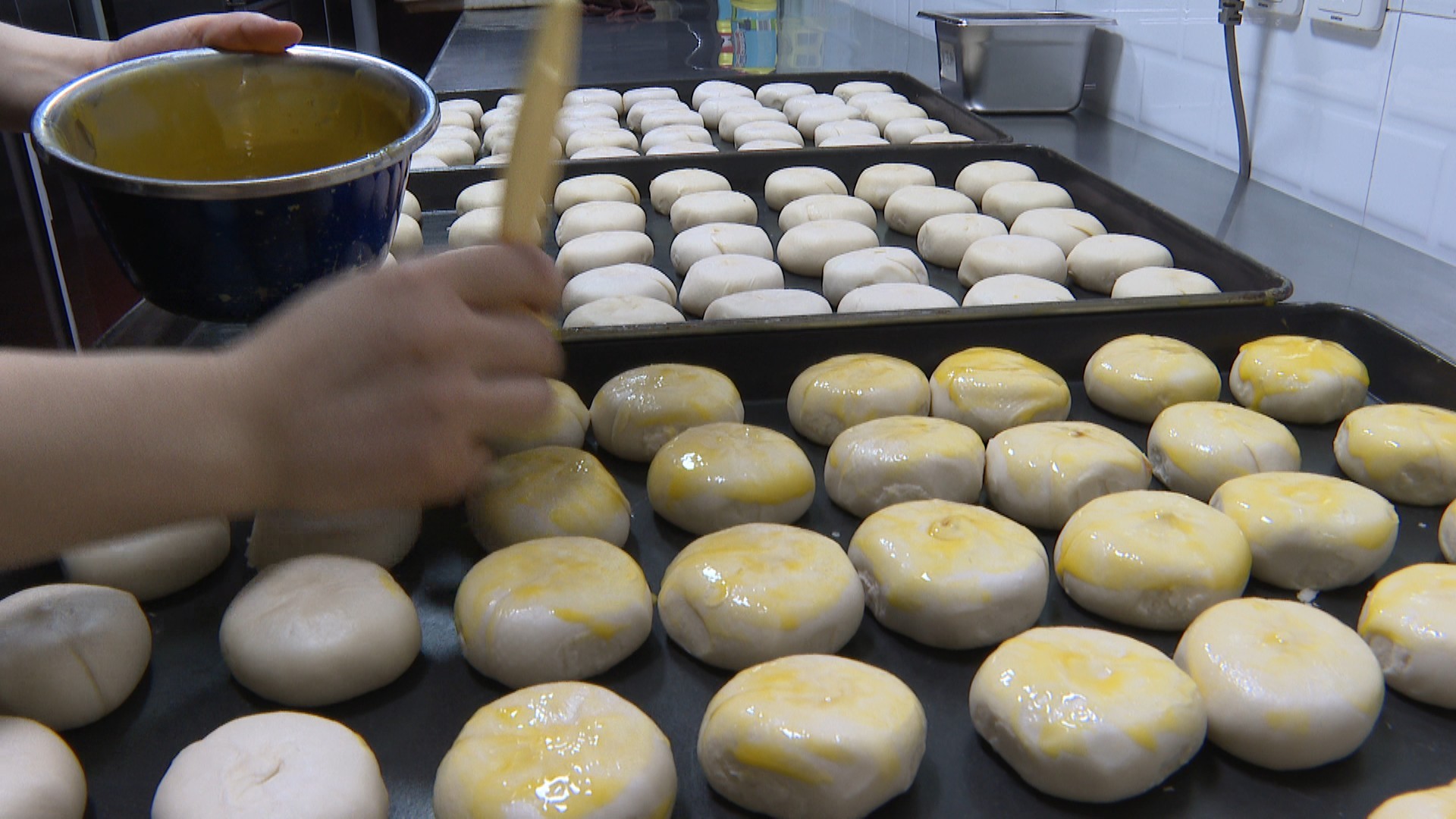 日前,记者走进咖佰莉烘焙店看到,店员正准备将当天包制的鲜肉月饼送进烤炉。经过十来分钟高温烤制,浅黄色的饼胚泛出了金色光泽,冒着滋滋热气的月饼出炉,空气中弥漫了混合油酥的鲜肉香气。而此时,已有顾客在店内等候。