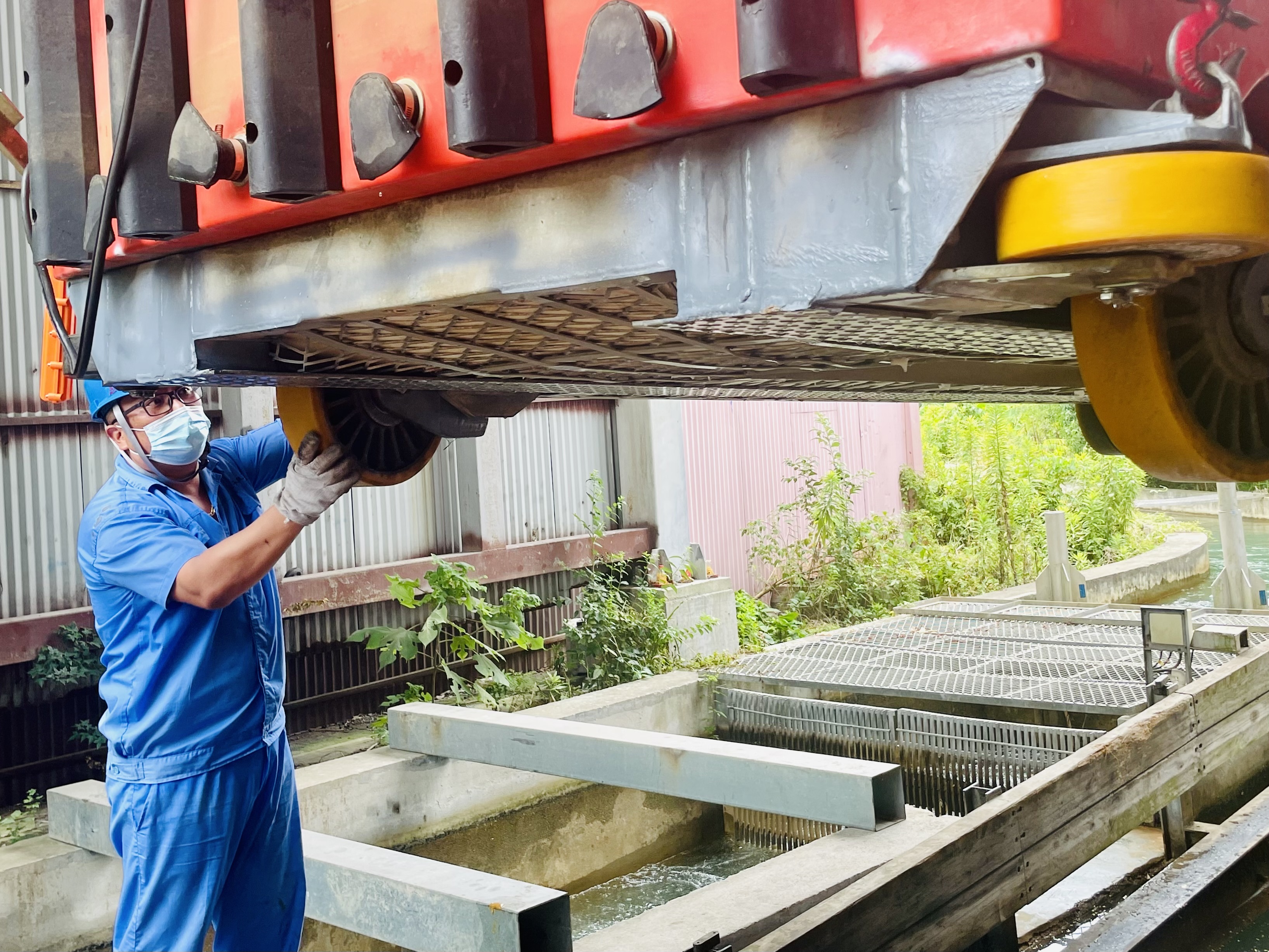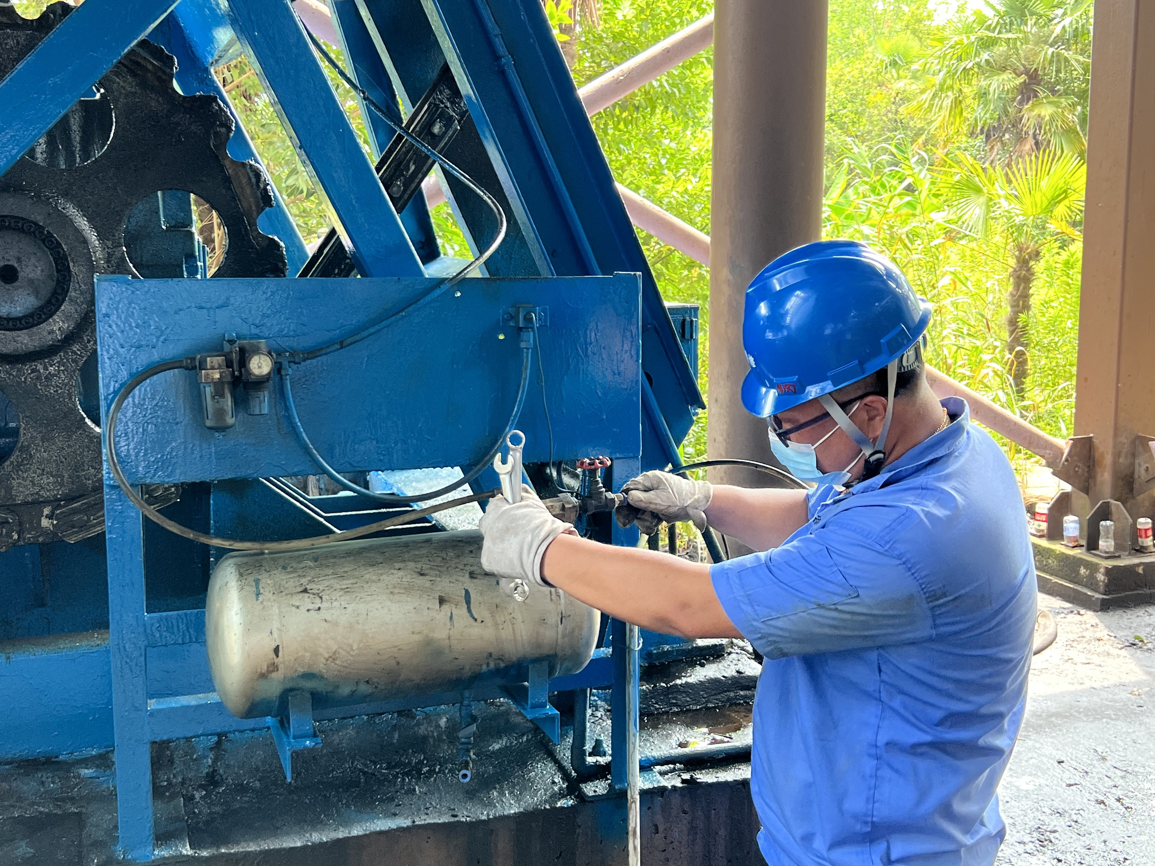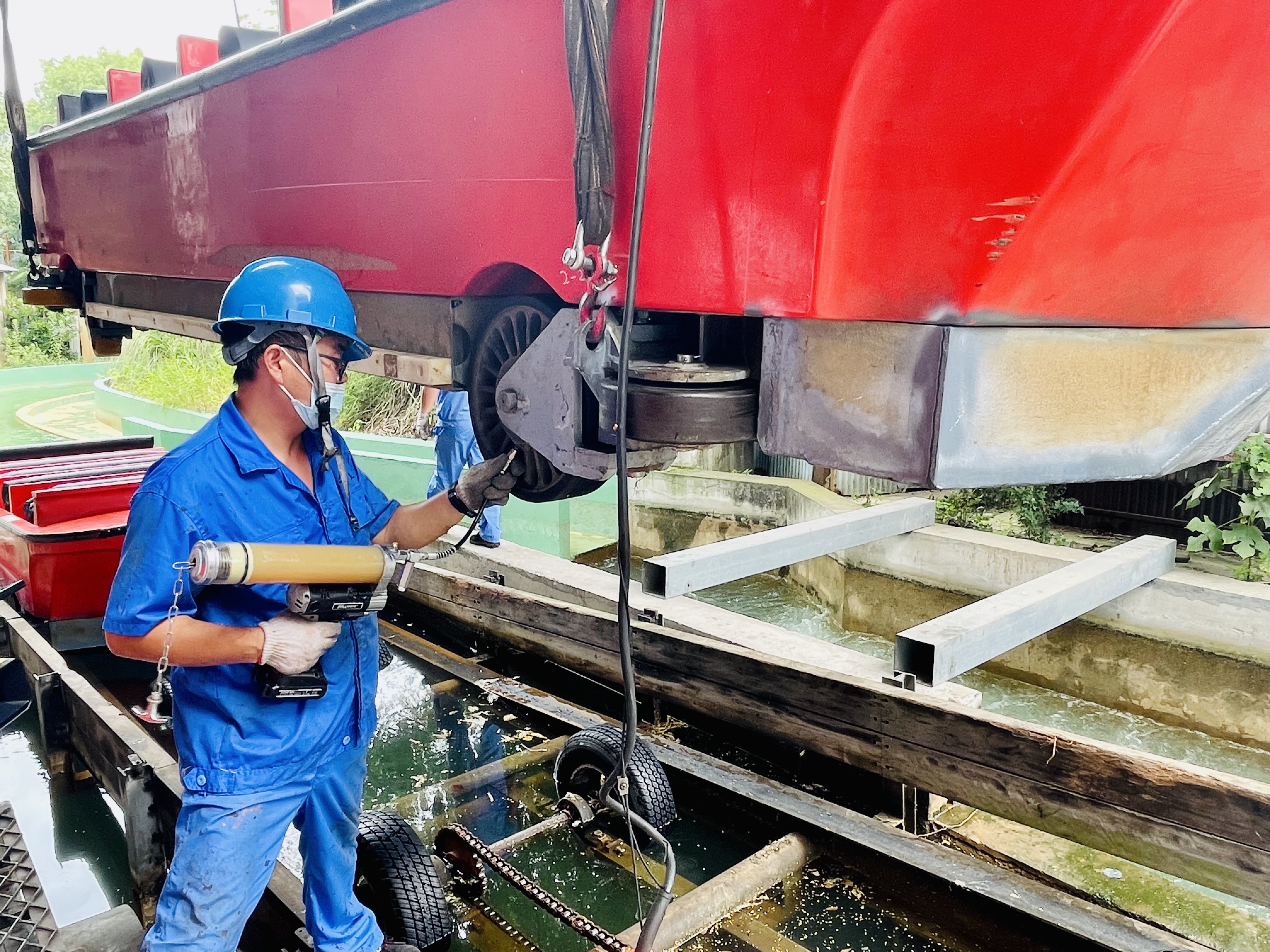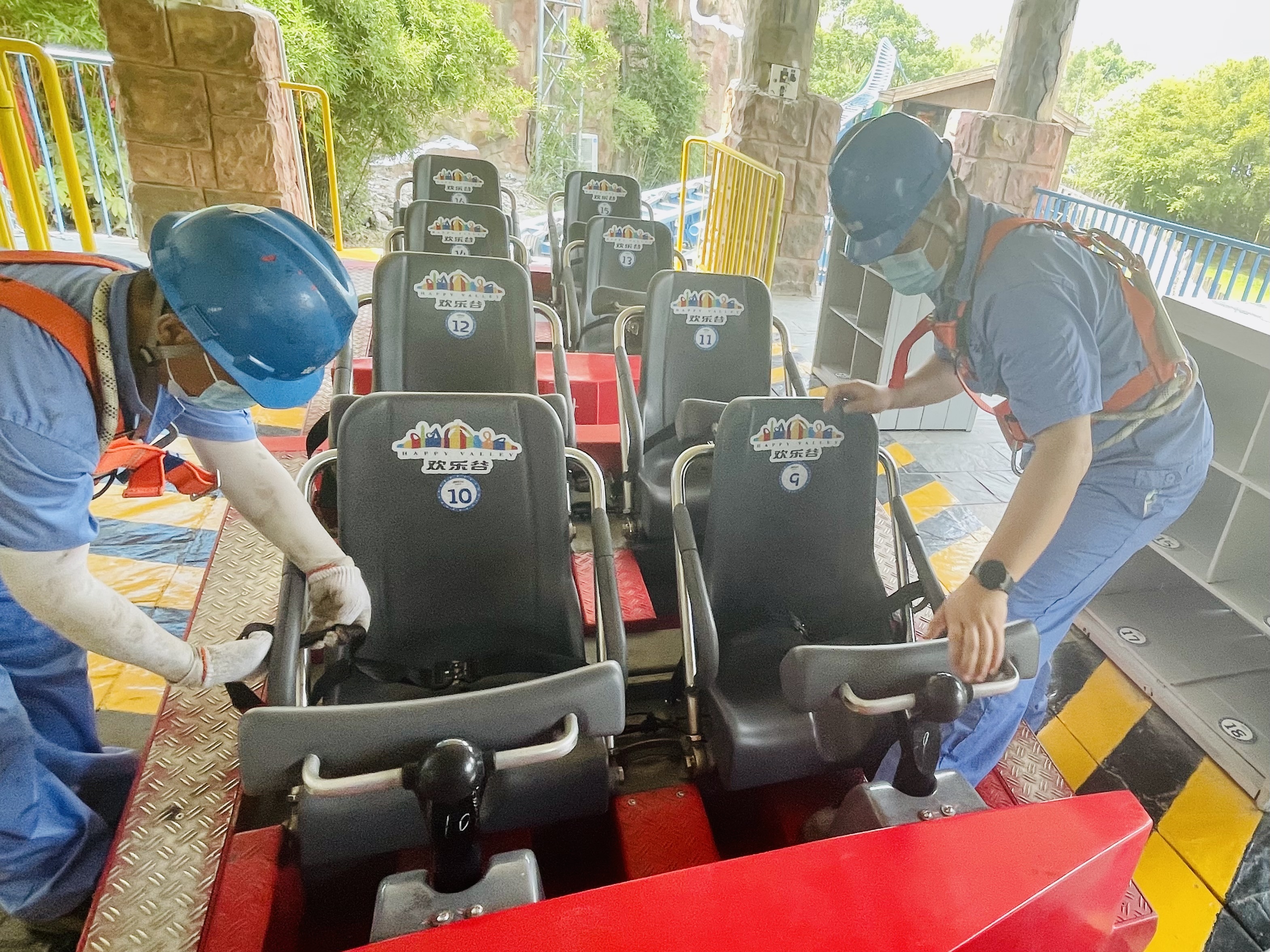 蓝月飞车是园内速度最快的过山车,维修师傅检查完车辆上的压杆后,沿着木梯一路向上检查,对高空位置的传感器、传感器线、固定螺栓等都进行了细致入微的检修。与此同时,记者在园内经典项目之一的“激流勇进”处看到,两位维修师傅一会儿站在水面钢板上,一会儿又钻入车辆底盘,查看运营车辆和停车处的每一条轮胎和每一处链轮链条,确保每一个螺丝都已拧紧。