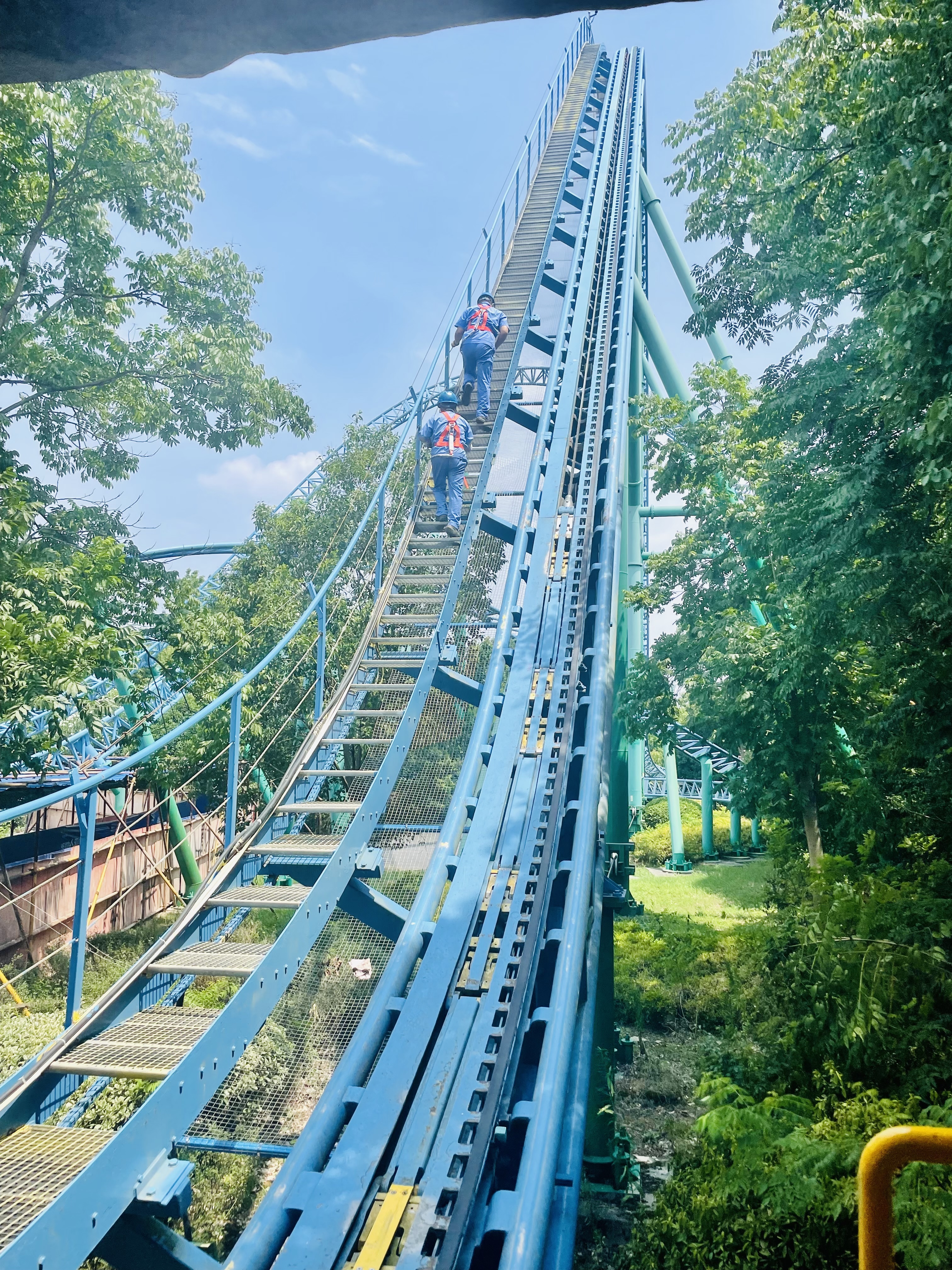 在上海欢乐谷,园内检修人员正汗流浃背地对游乐设施进行检测维修。此时电瓶车皮垫温度已超80℃,他们穿着定制的工作服,戴着安全帽和工作手套检测维修相关设施,为游客安全护航。采访当天,上海欢乐谷对园内大摆锤、水上飞艇、旋转摇摆伞、欢乐风火轮等六个游乐设施进行周检。
